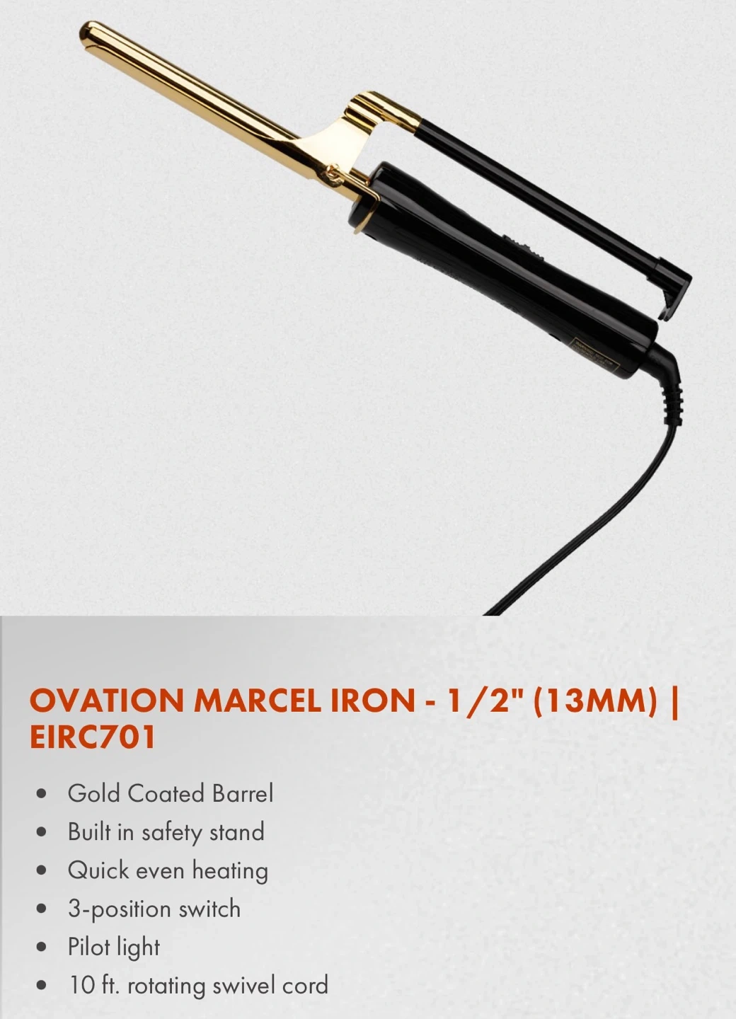 Ovation Marcel iron with a gold-coated barrel. It's got quick even heating and a 3-position switch. Includes a 10 ft. rotating swivel cord.