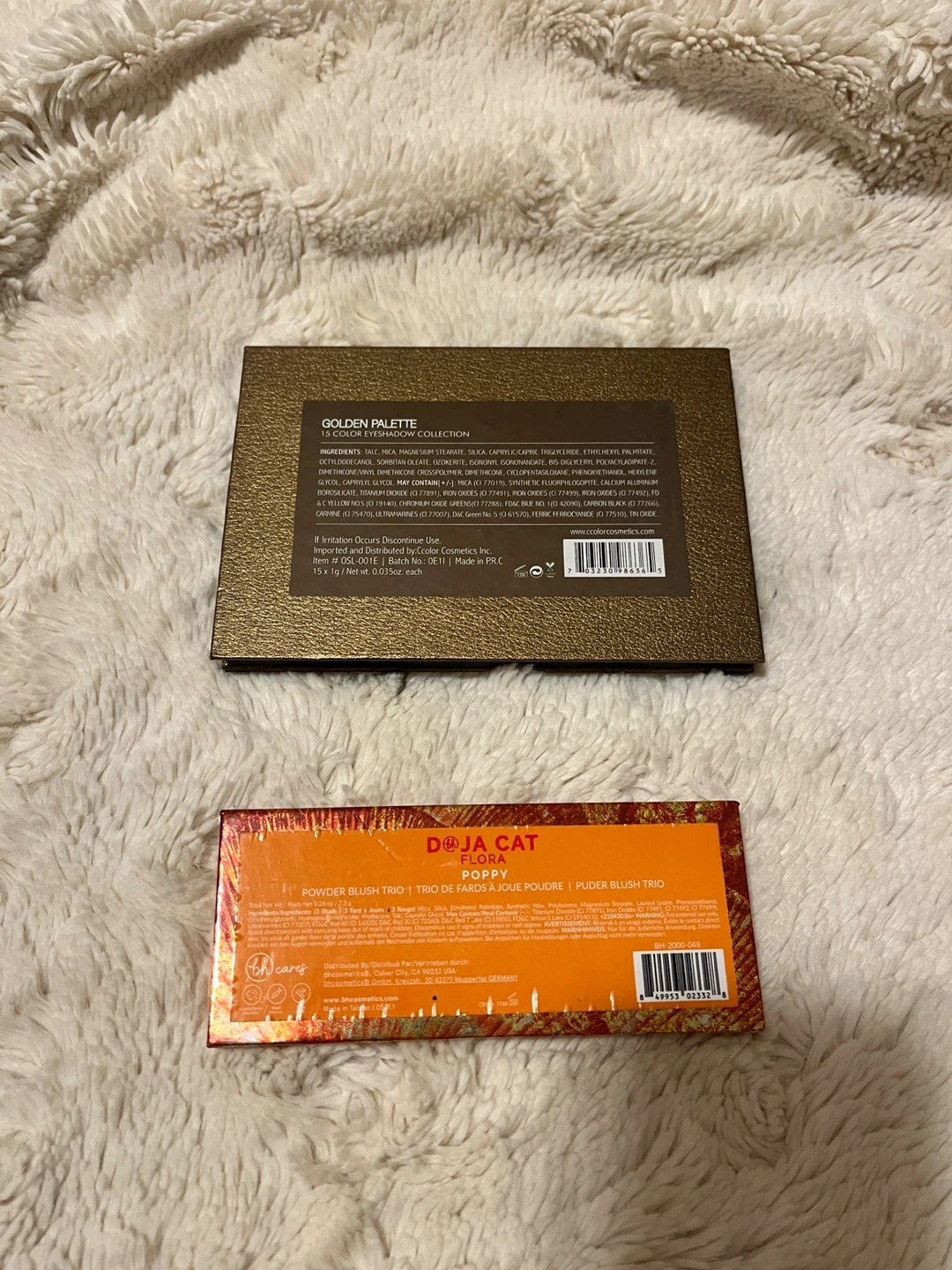 This listing includes a Golden Palette eyeshadow palette with 15 shades and a Doja Cat x BH Cosmetics blush trio. The blush trio contains three warm-toned shades.