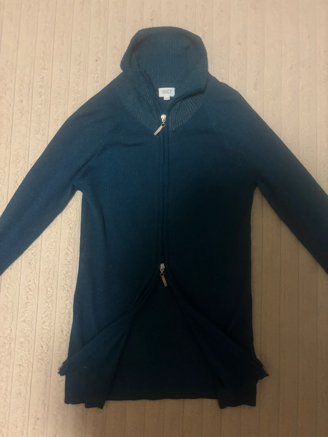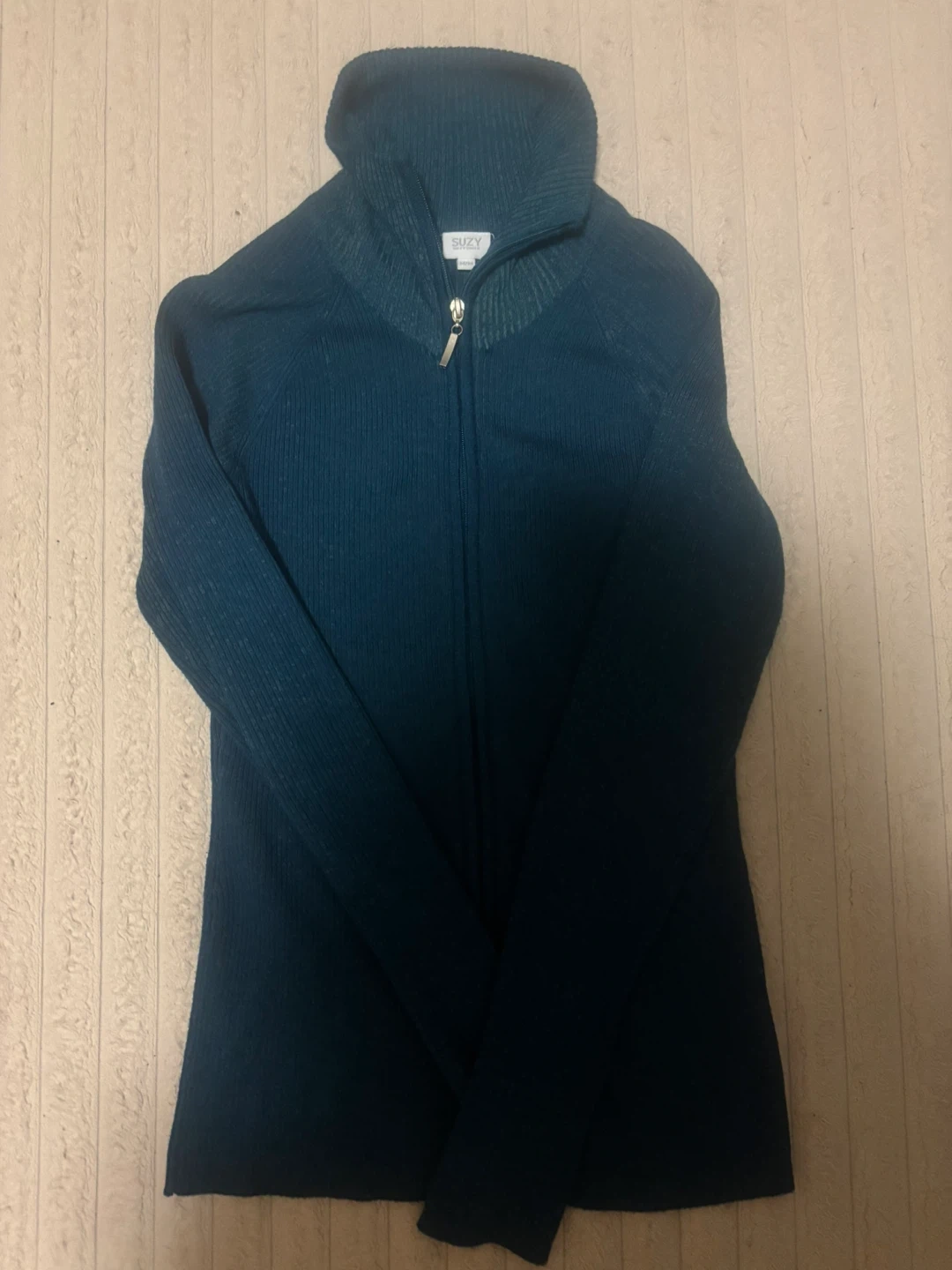 Teal zip-up cardigan from Suzy Shier. Ribbed knit texture with a stand-up collar. Size M/M. Perfect condition.