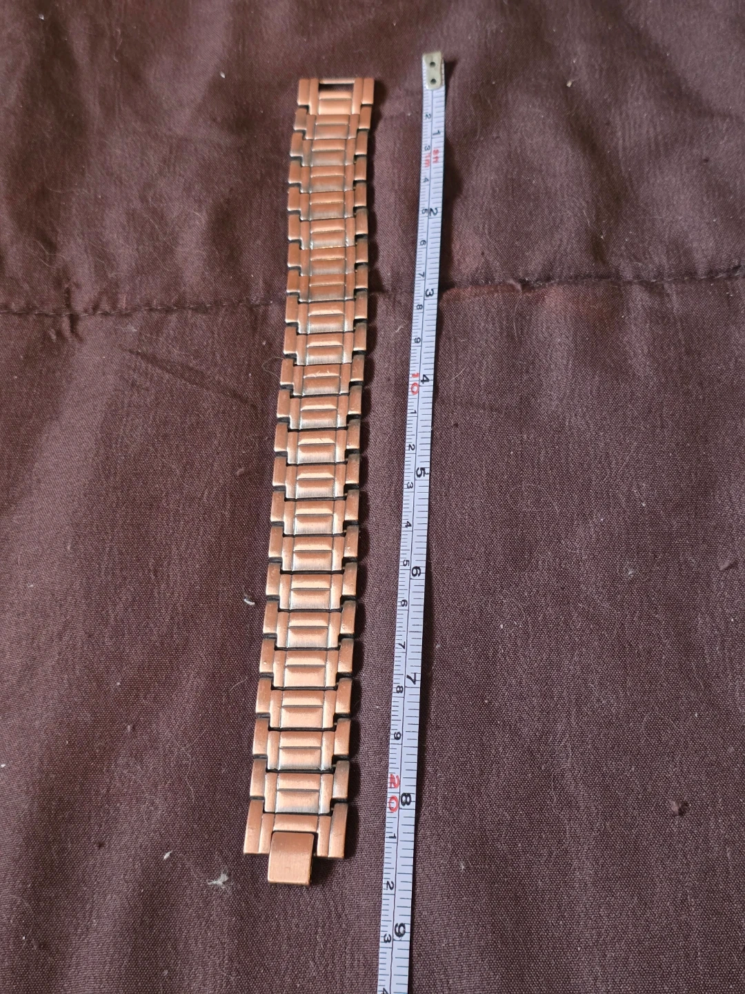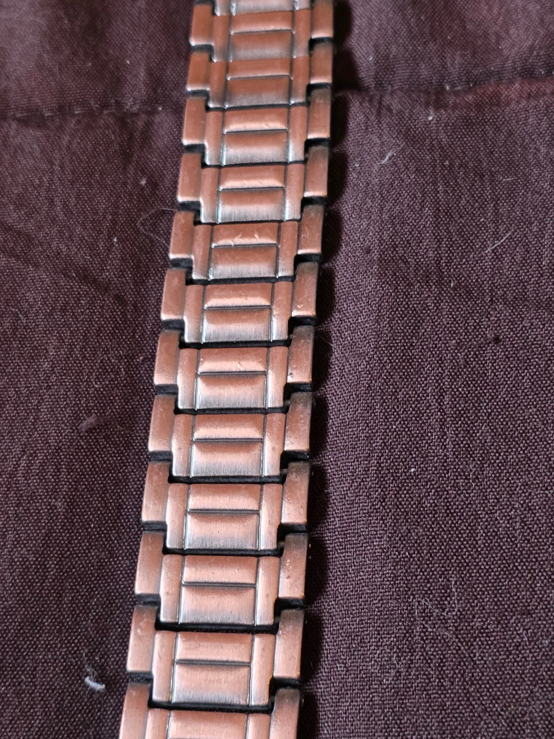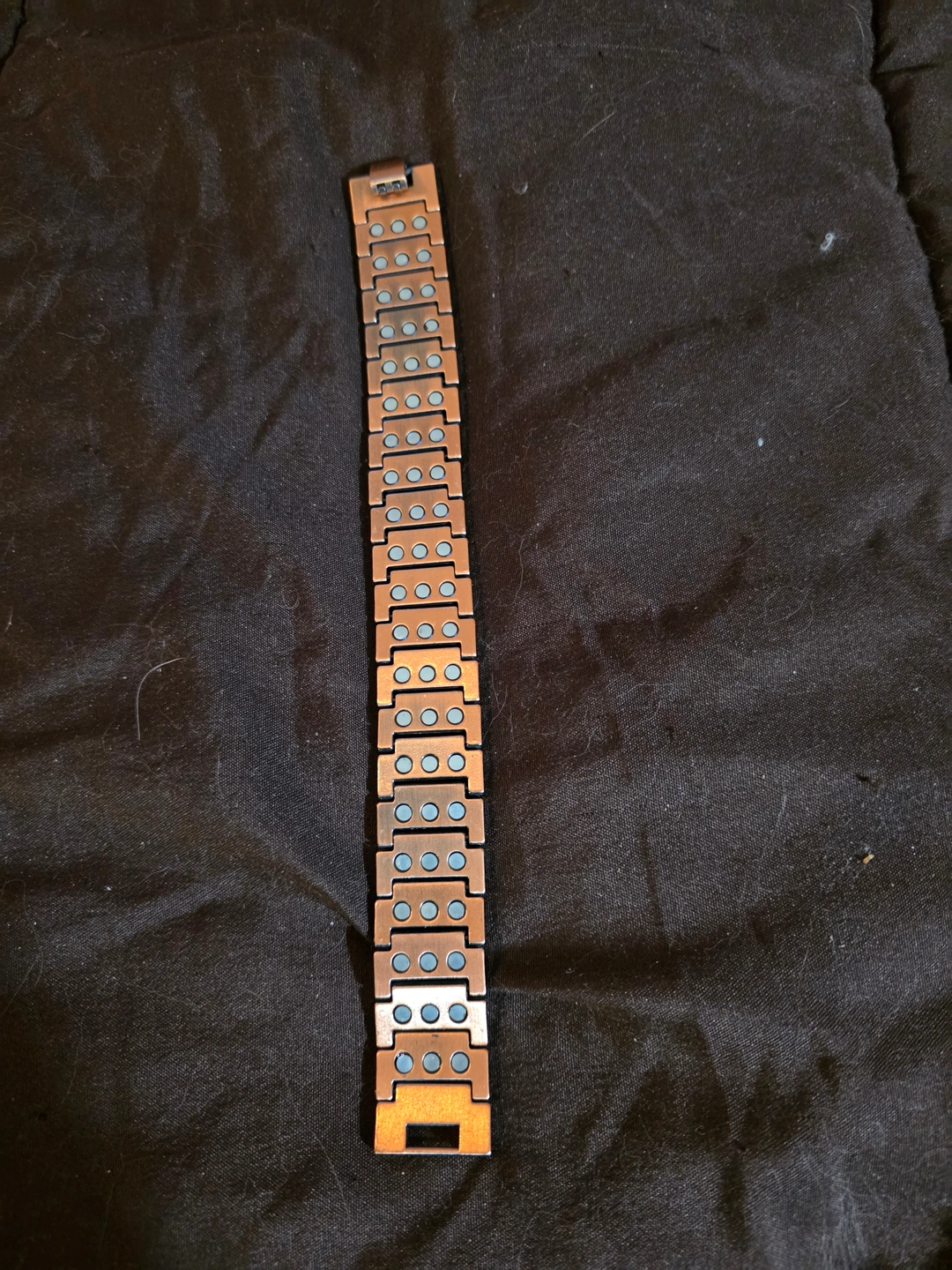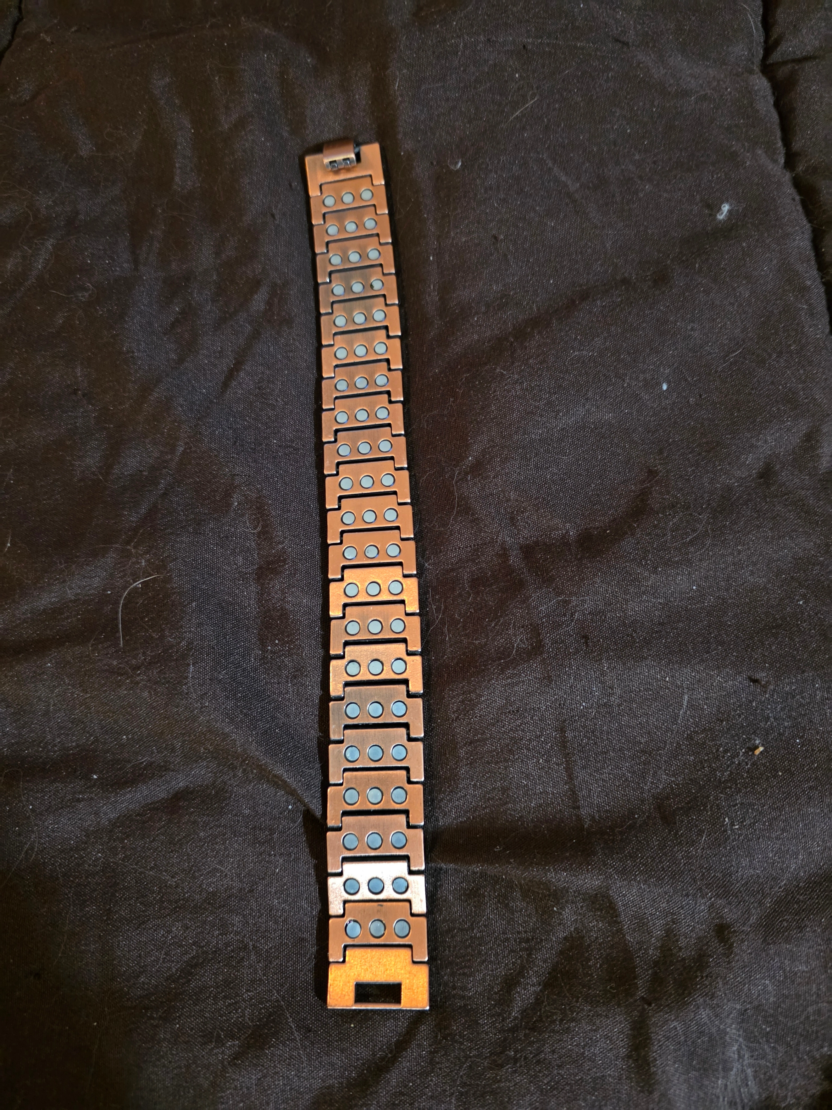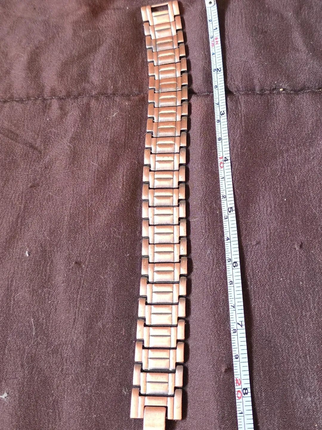 A Magnetic Copper men'sBracelet. It measures approximately 7.5 inches in length. This band is made of metal.