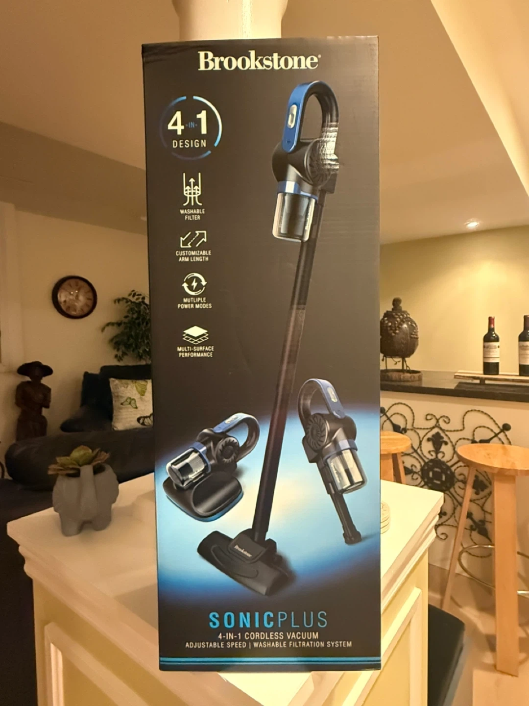 This Brookstone SonicPlus is a 4-in-1 cordless vacuum. It is only good for small surfaces. This Backup vacuum features a washable filter, ON & OFF one power button, & smooth glide design. Battery power is 1500 mAh with 6 kPa suction power.