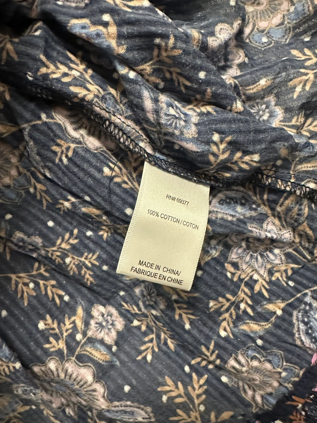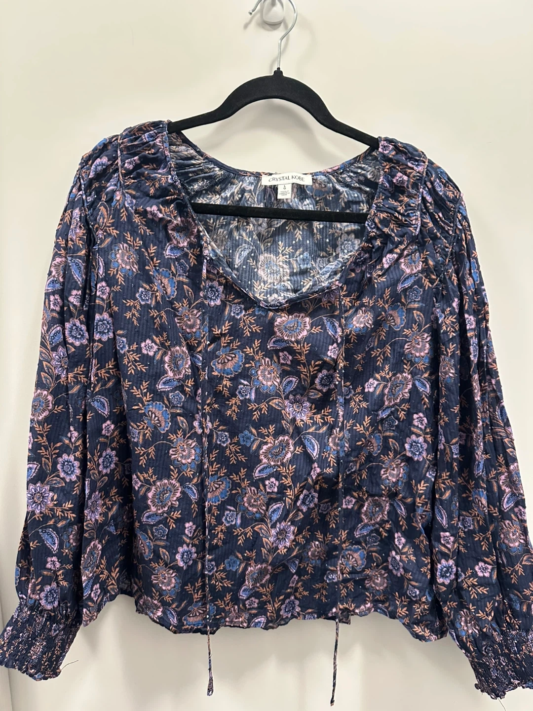 *Brand New* ladies long sleeve peasant-style shirt in navy floral design. Ribbed cuffs.