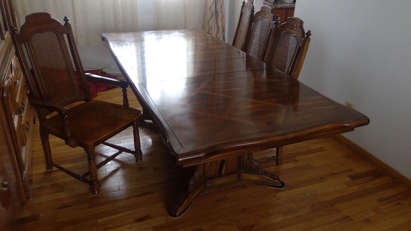 - Includes table, 5 chairs, and leaves/extensions