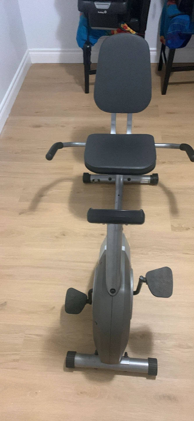 Velocity recumbent exercise bike with a digital fitness monitor. It's silver and black, featuring a comfortable seat and pedals. This bike is great for low-impact cardio workouts at home.