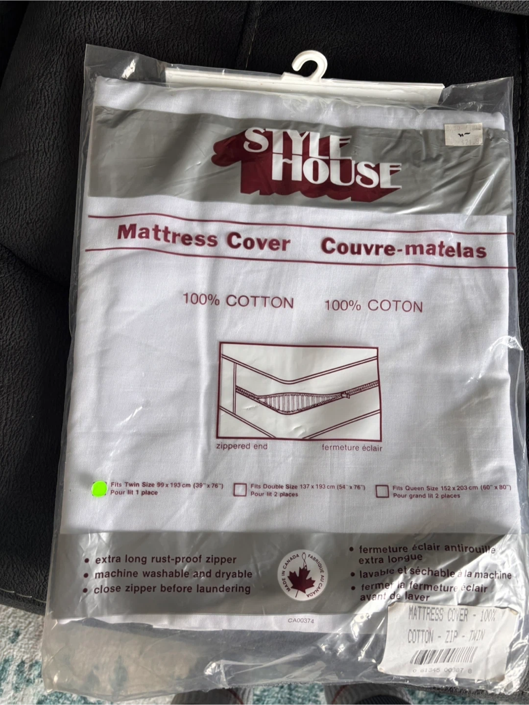 This is a Style House 100% cotton mattress cover. It fits Twin size mattresses (99 x 193 cm / 39" x 76"). It has an extra long rust-proof zipper and is machine washable and dryable.