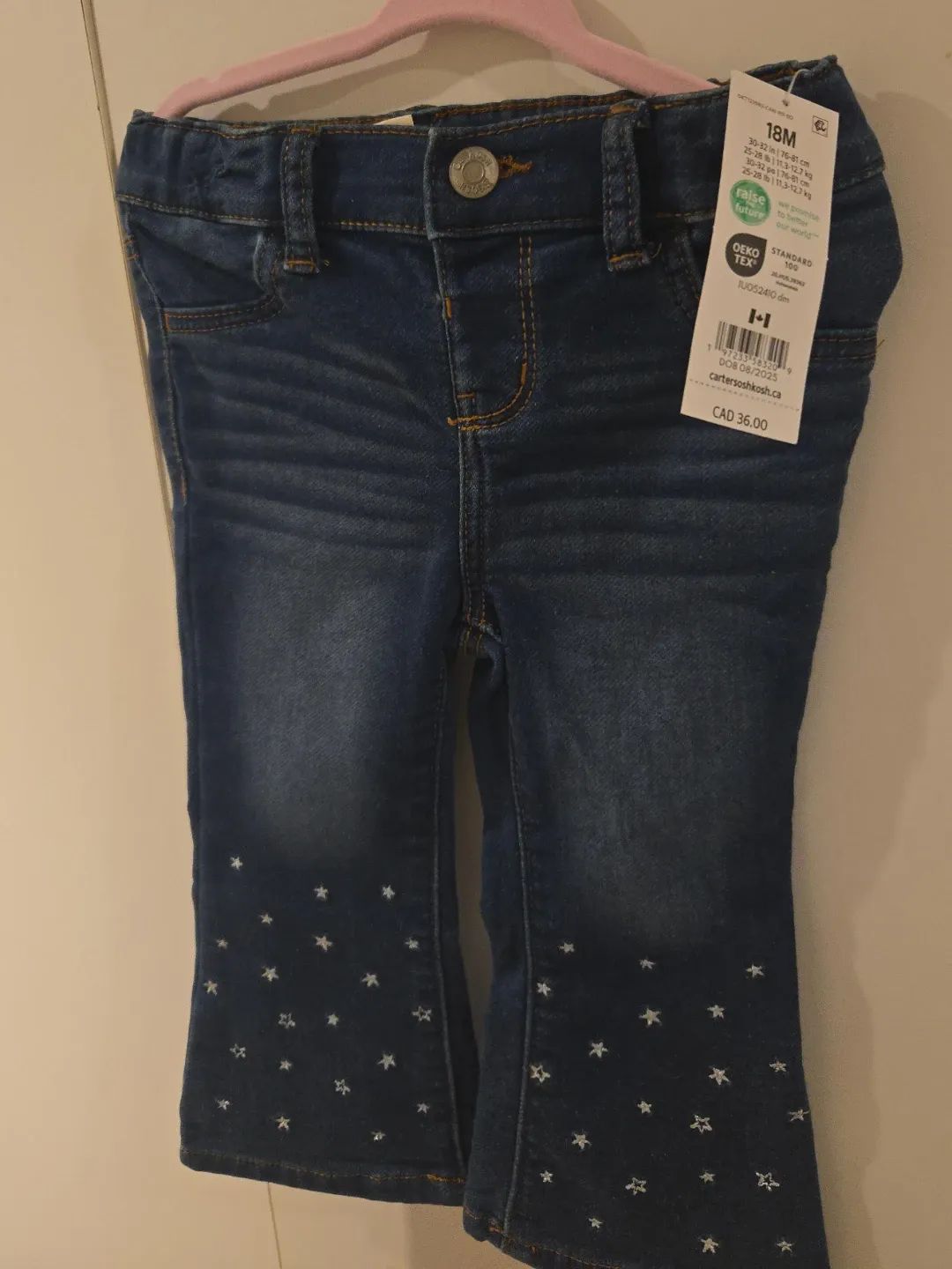 These Carter's OshKosh jeans are brand new with tags and ready for your little one! They're size 18M and feature a cute star pattern on the bottom. The original price was CAD $36.00. The manufacturing date is August 2025