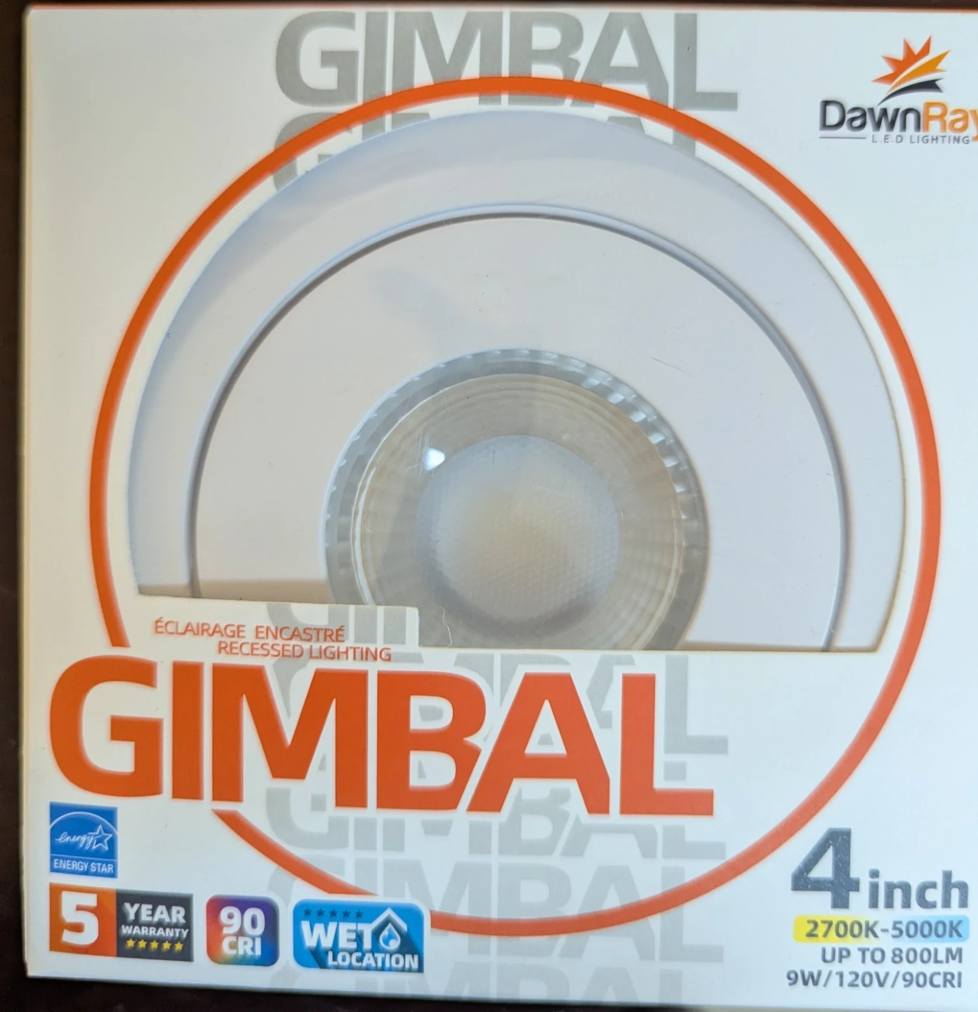 This is a 4-inch recessed LED lighting fixture from DawnRay. It has a color temperature range of 2700K to 5000K and an output of up to 800 lumens. It's suitable for wet locations and comes with a 5-year warranty. The fixture uses 9W and is compatible with 120V or 90V.