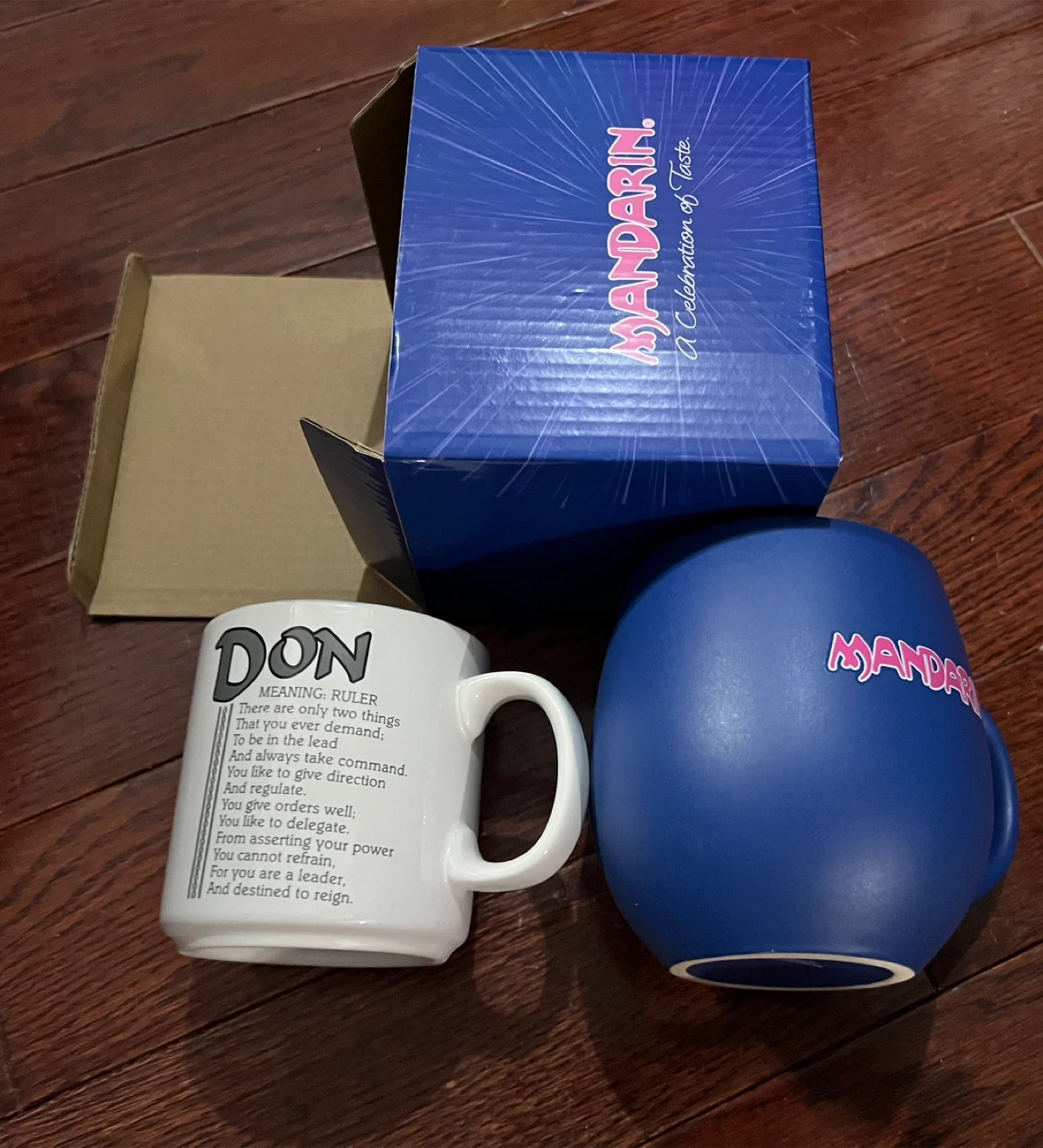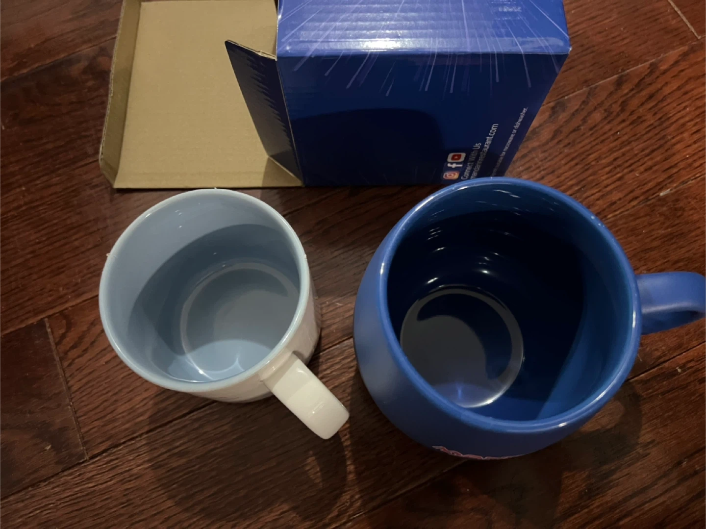 Mandarin blue mug not dishwasher or microwave safe. White mug no information listed.