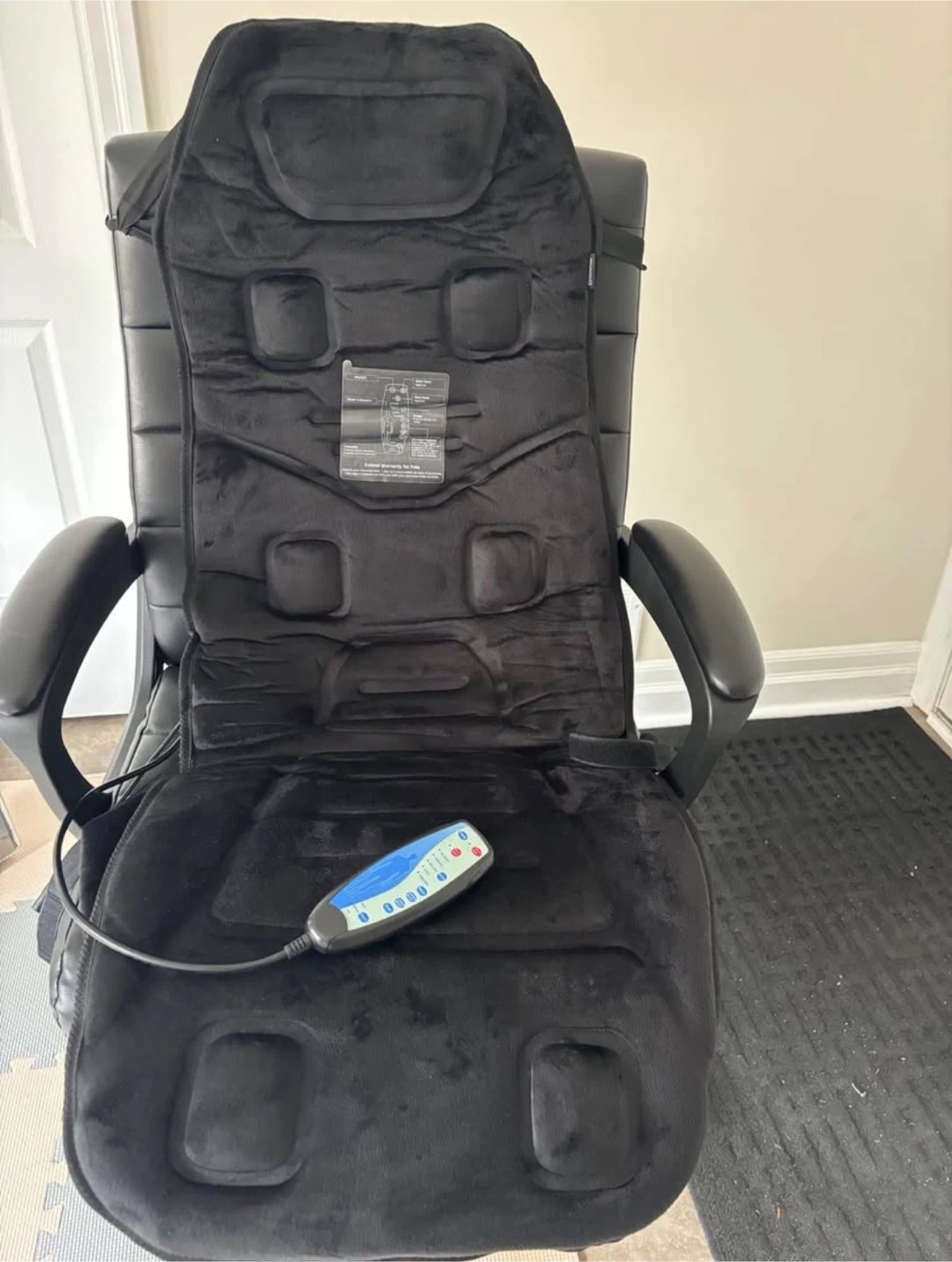 This black massage seat cushion is designed to provide a relaxing experience. It's made of soft material and comes with a remote control for adjusting settings. This cushion can be used on most chairs to add a massage function.