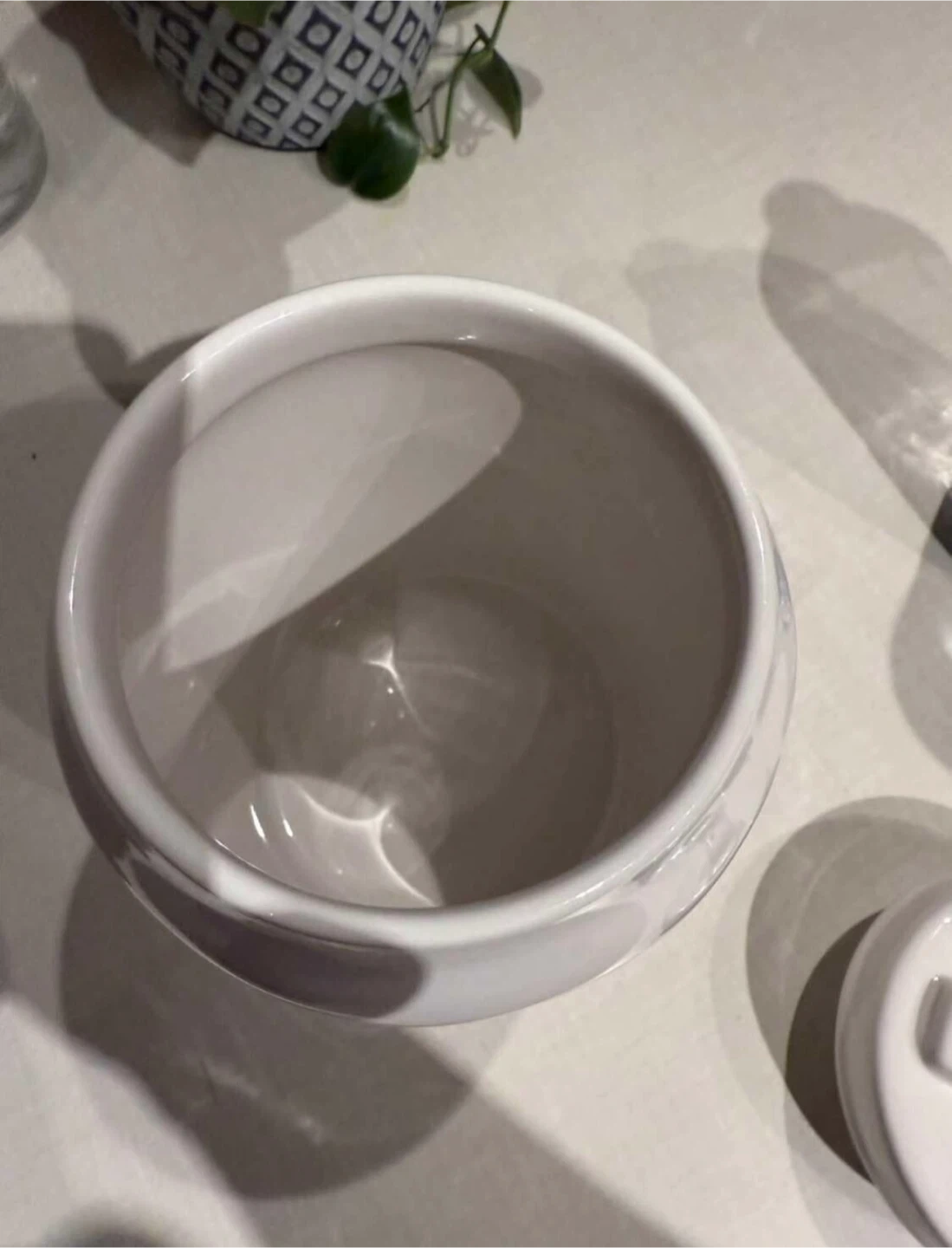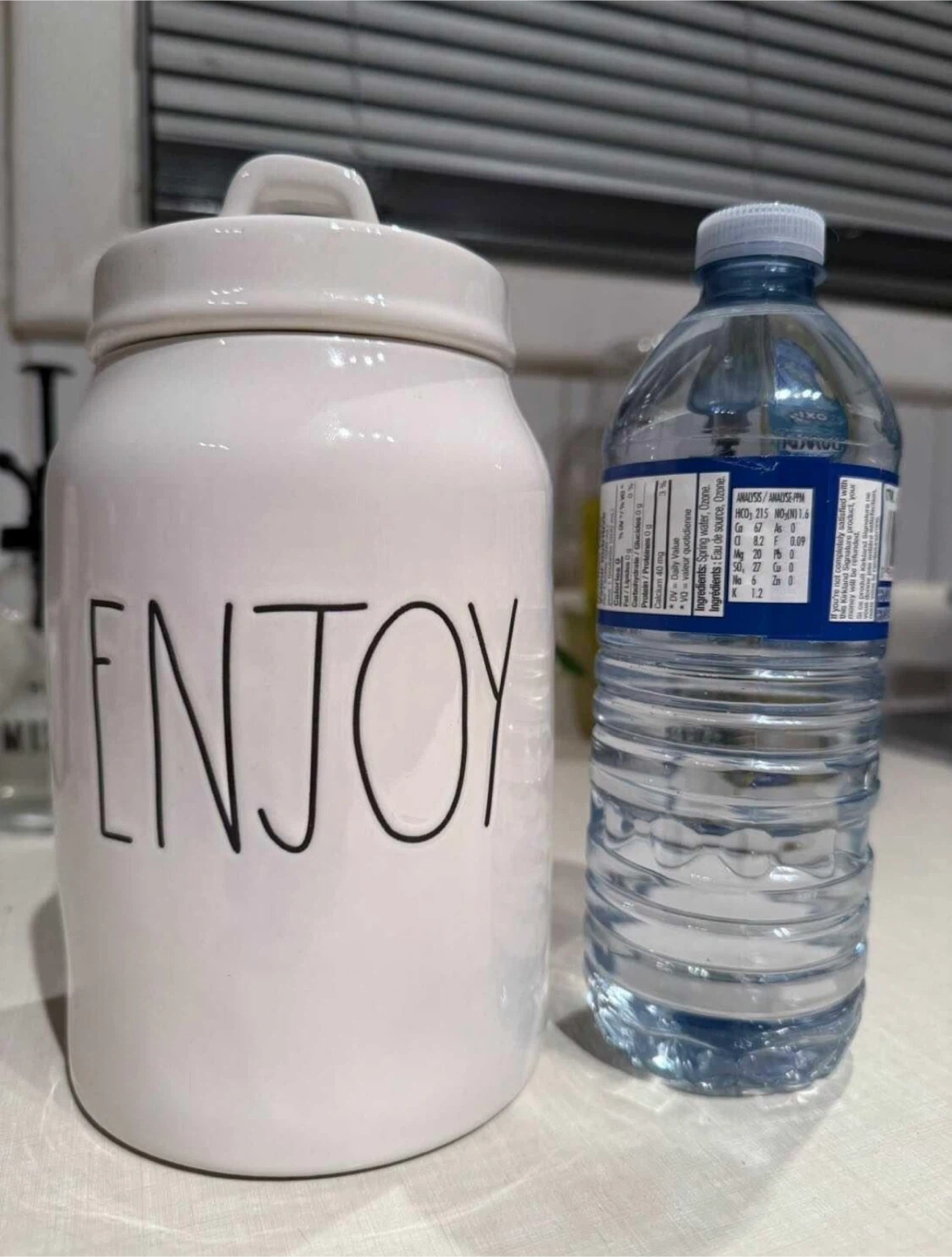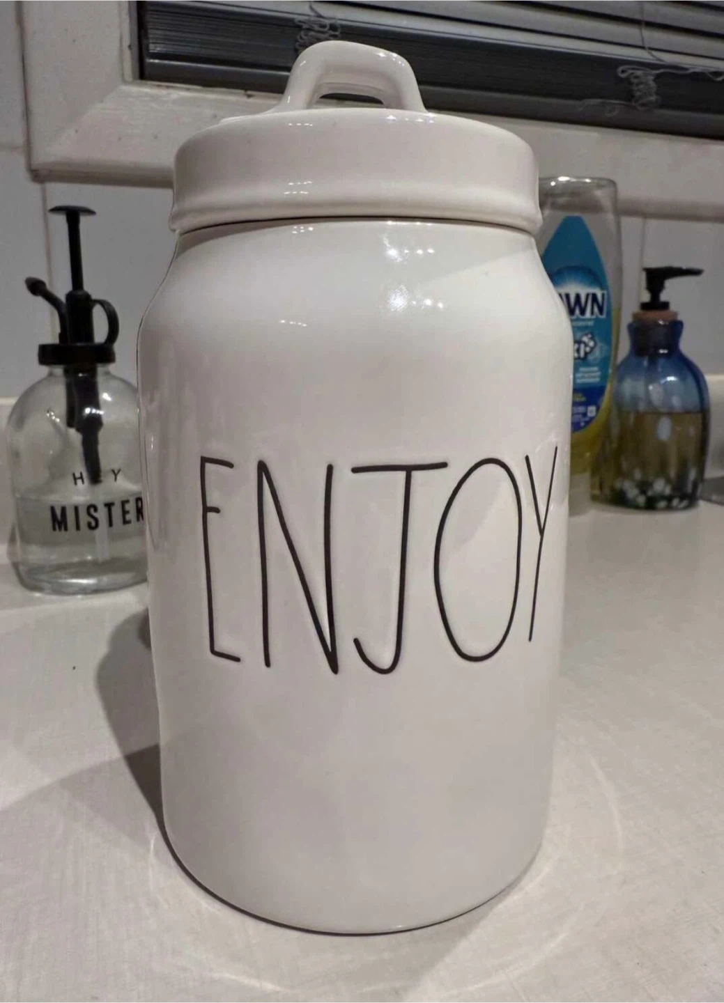Rae Dunn canister with "Enjoy" printed on the front. It has a lid with a handle. Perfect for countertop storage or decor.