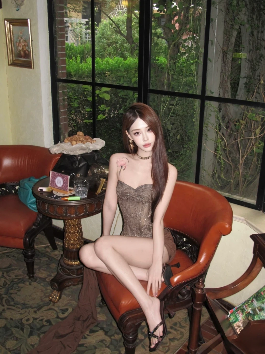 This stunning corset dress comes in a rich brown hue, featuring intricate detailing on the bodice and a flowing skirt. It's perfect for a special occasion or a glamorous night out! The fabric has a slightly shimmering quality.