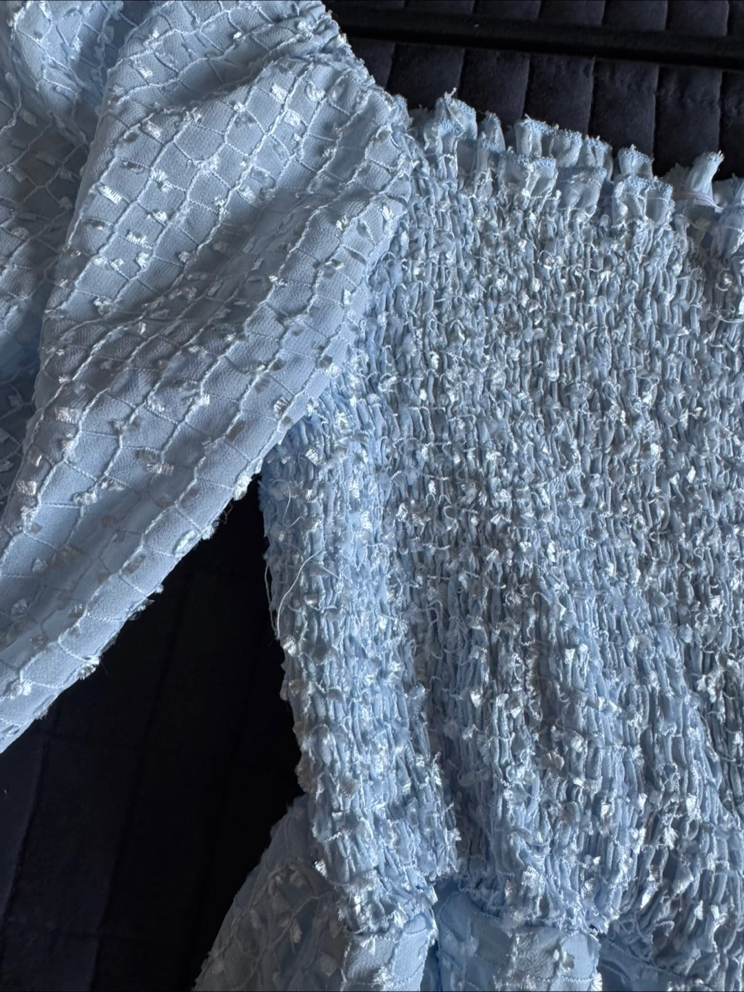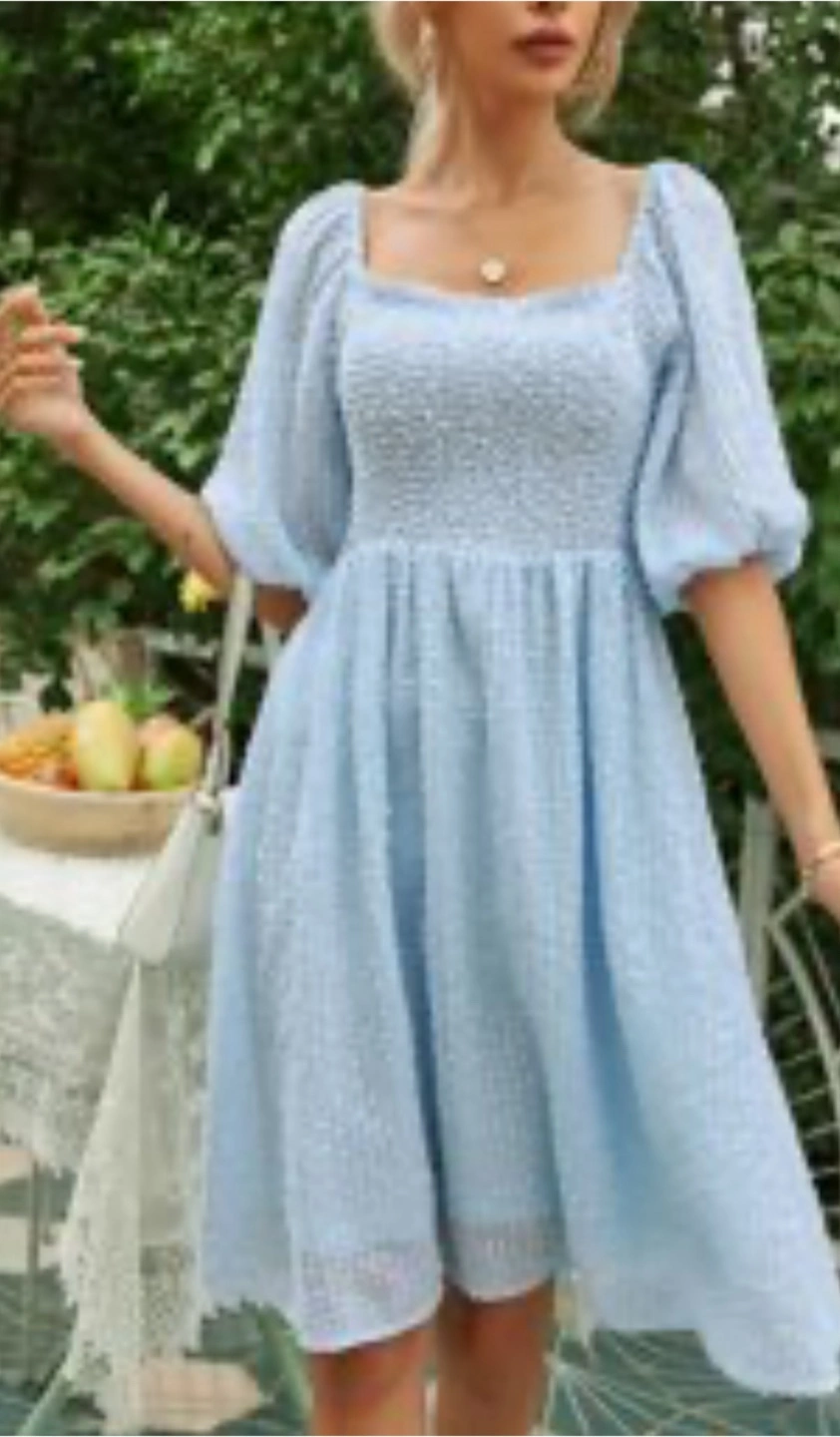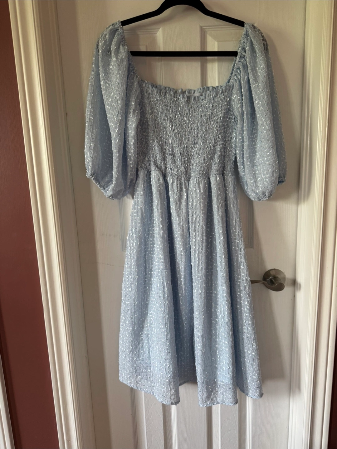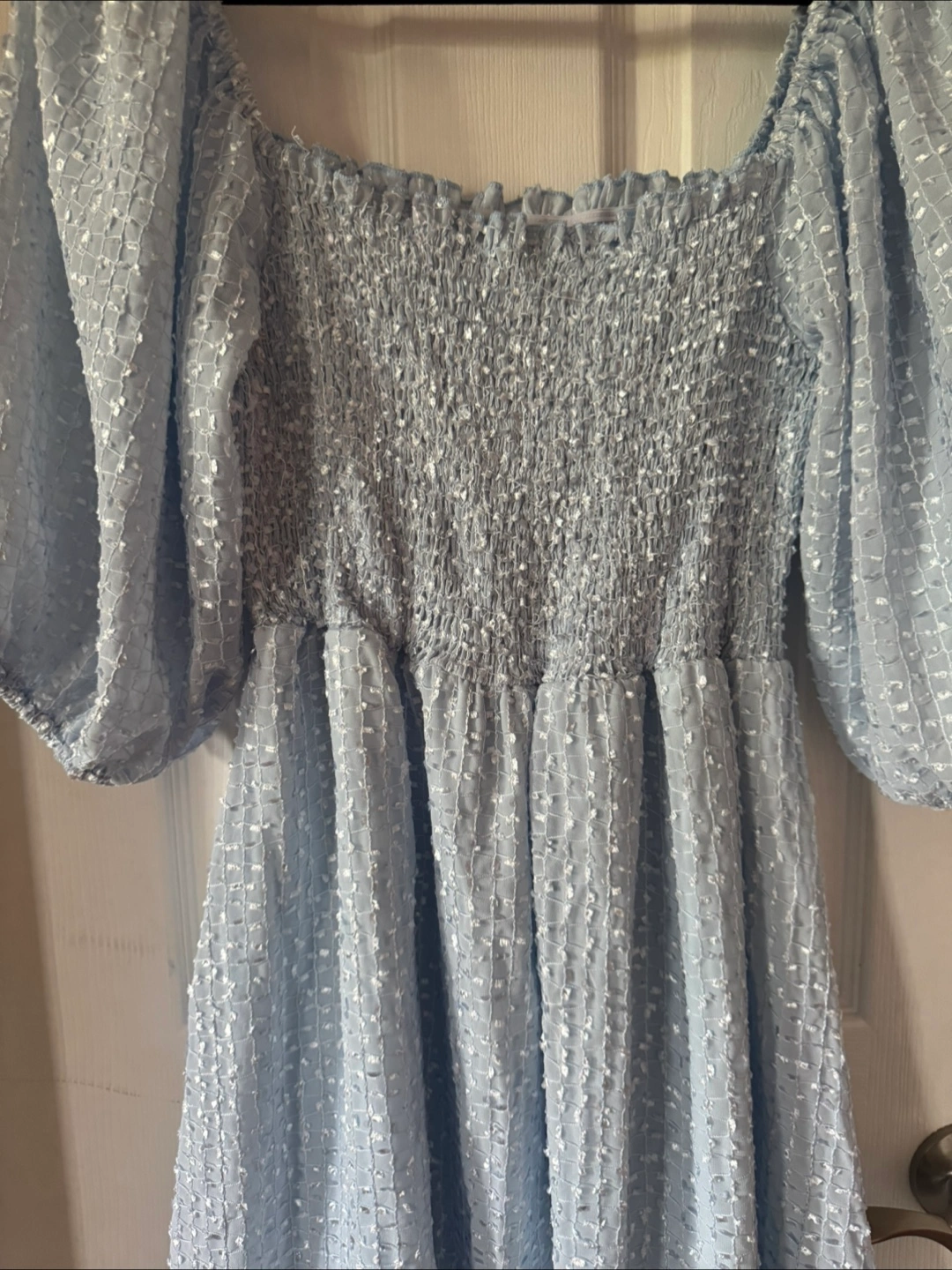 Selling a cute baby blue dress with smocked bodice and puff sleeves! It's in great condition and perfect for summer days
