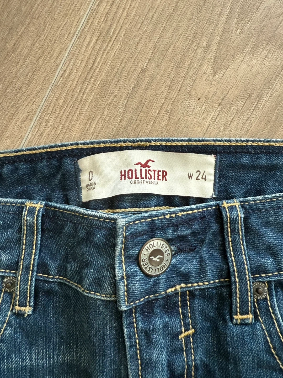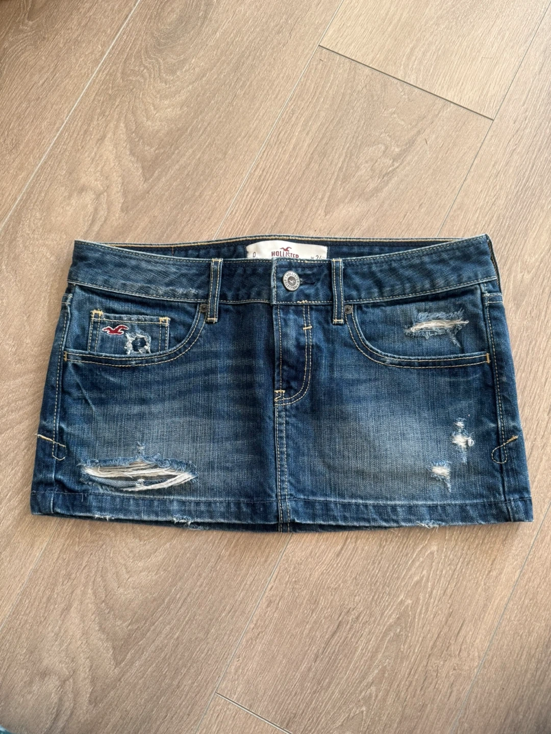 Vintage Hollister denim mini skirt. Size is W24. Dark wash with distressed detailing. Denim material. Only worn once or twice selling since its big on me.