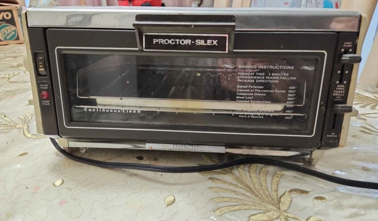 This is a Proctor-Silex toaster oven. It has a 'Continuous Clean' interior and baking instructions printed on the inside of the door. The oven has adjustable temperature and toast settings.
