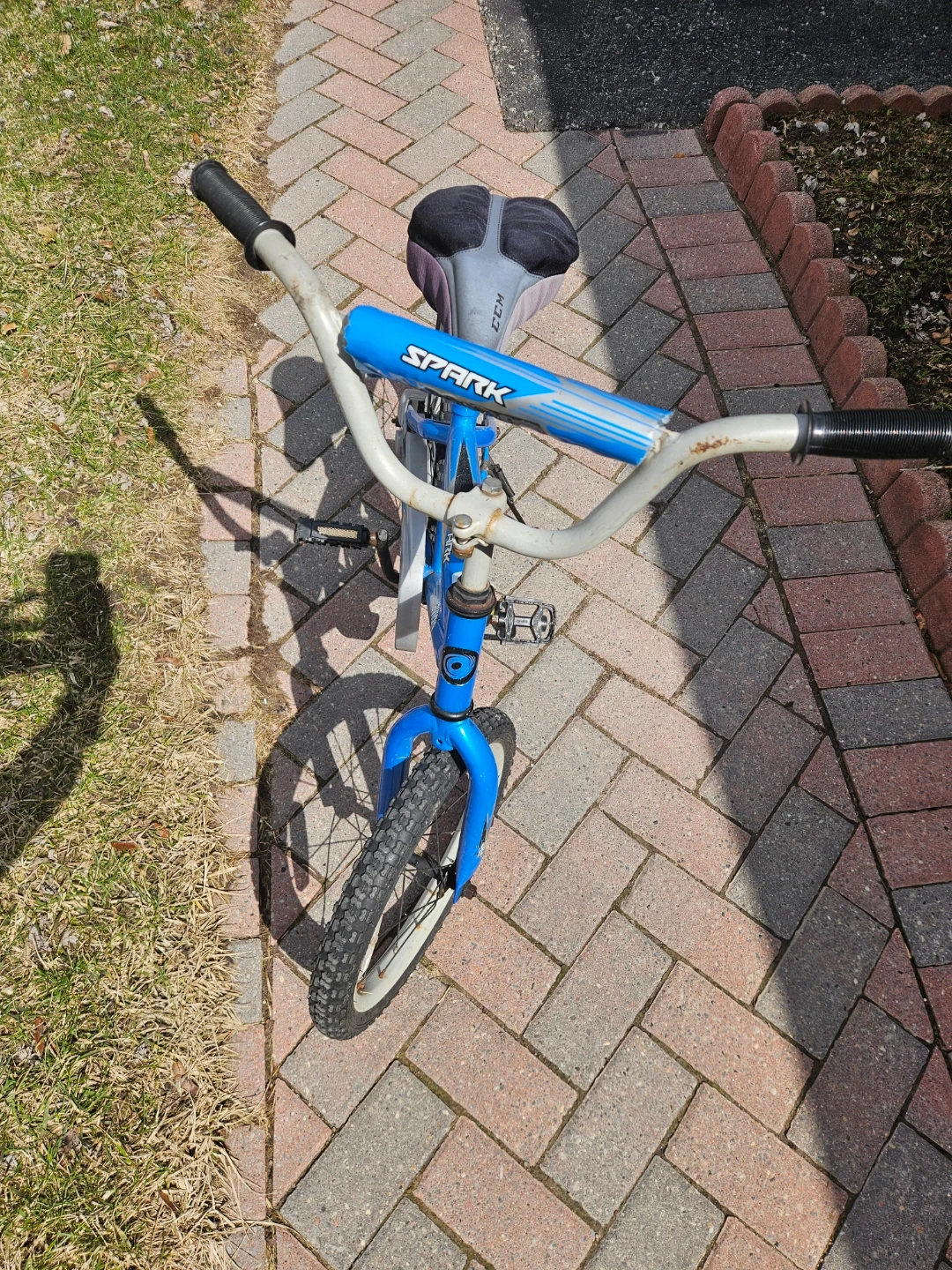 This is a blue Avigo Spark kids bike. It has a sturdy frame and easy-to-grip handlebars. It's a great starter bike for learning to ride!