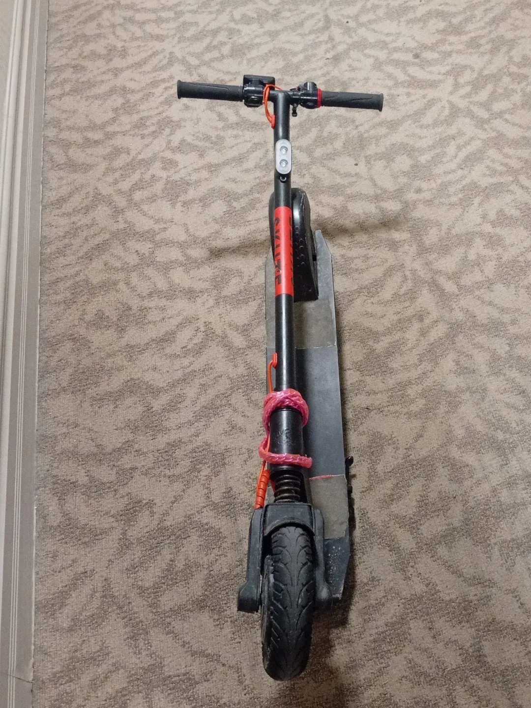 This Segway Ninebot electric kickscooter is black with red accents. It features a front suspension for a smoother ride. A bright LED headlight is included for visibility.