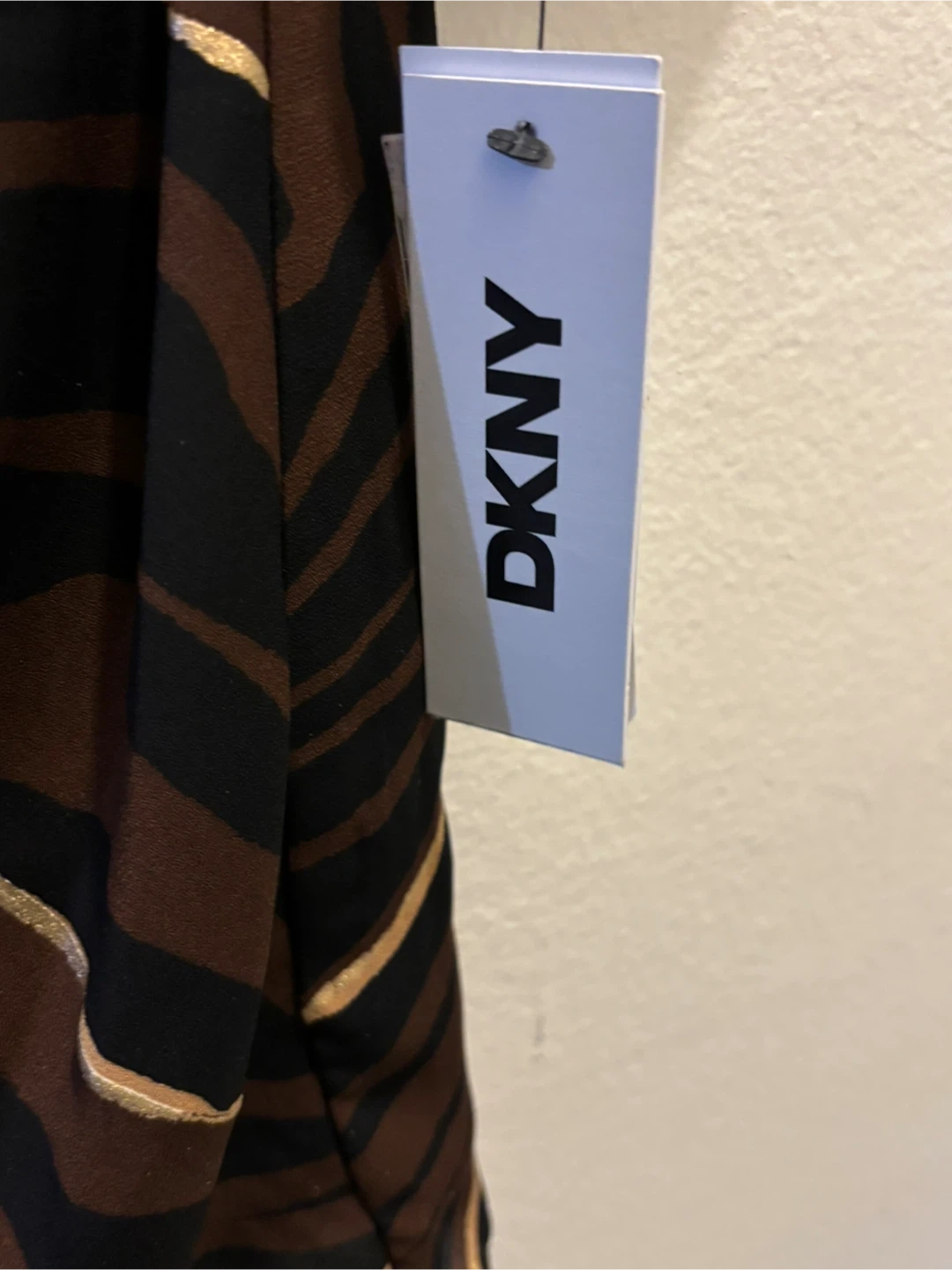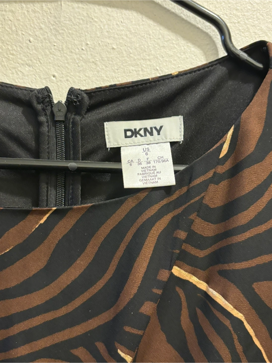 DKNY midi dress with a striking zebra print. It features a flattering twist-front design and long sleeves. This dress is size US 6.