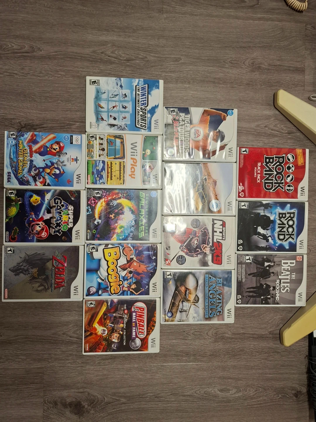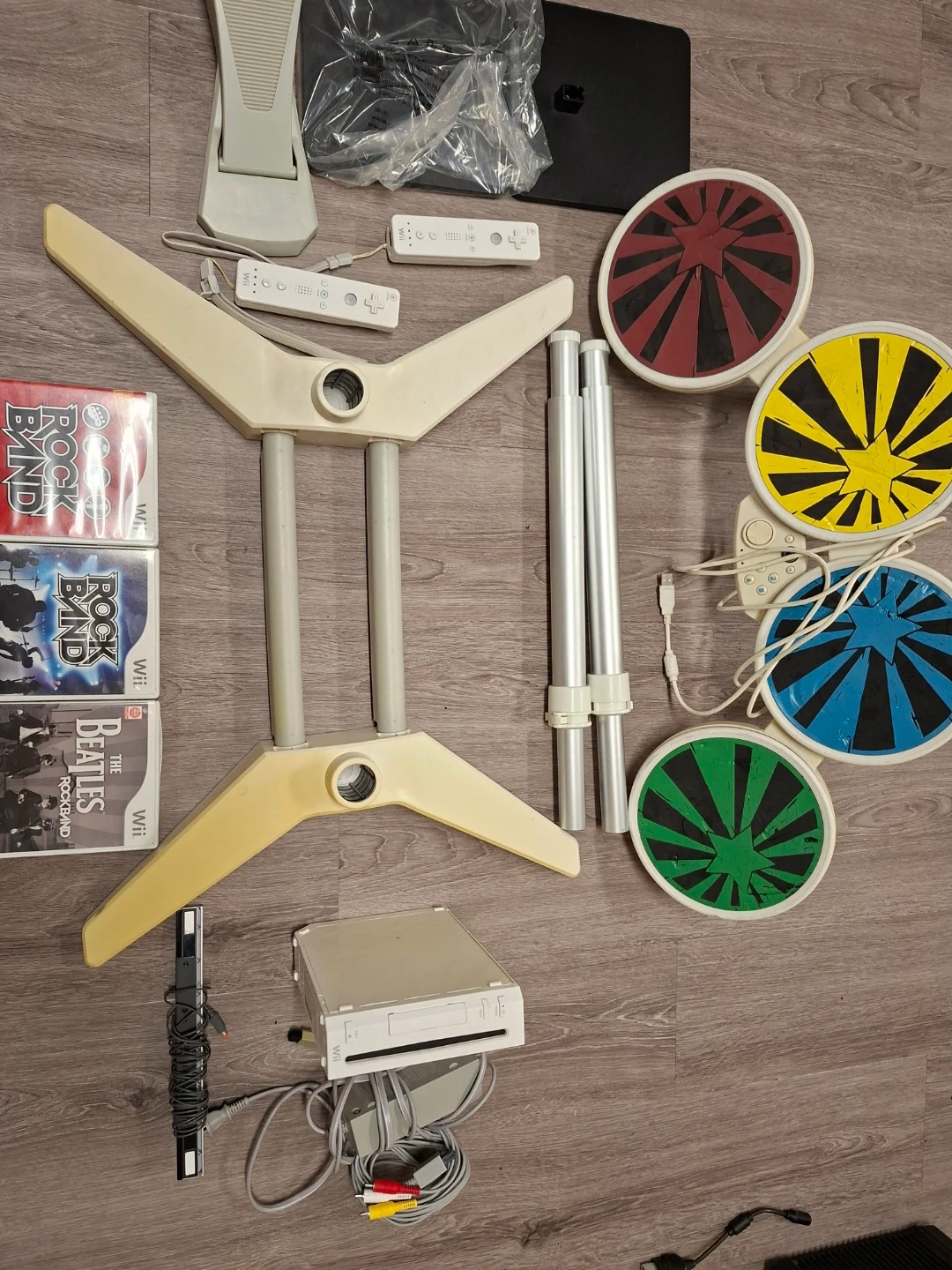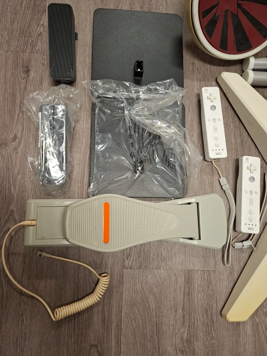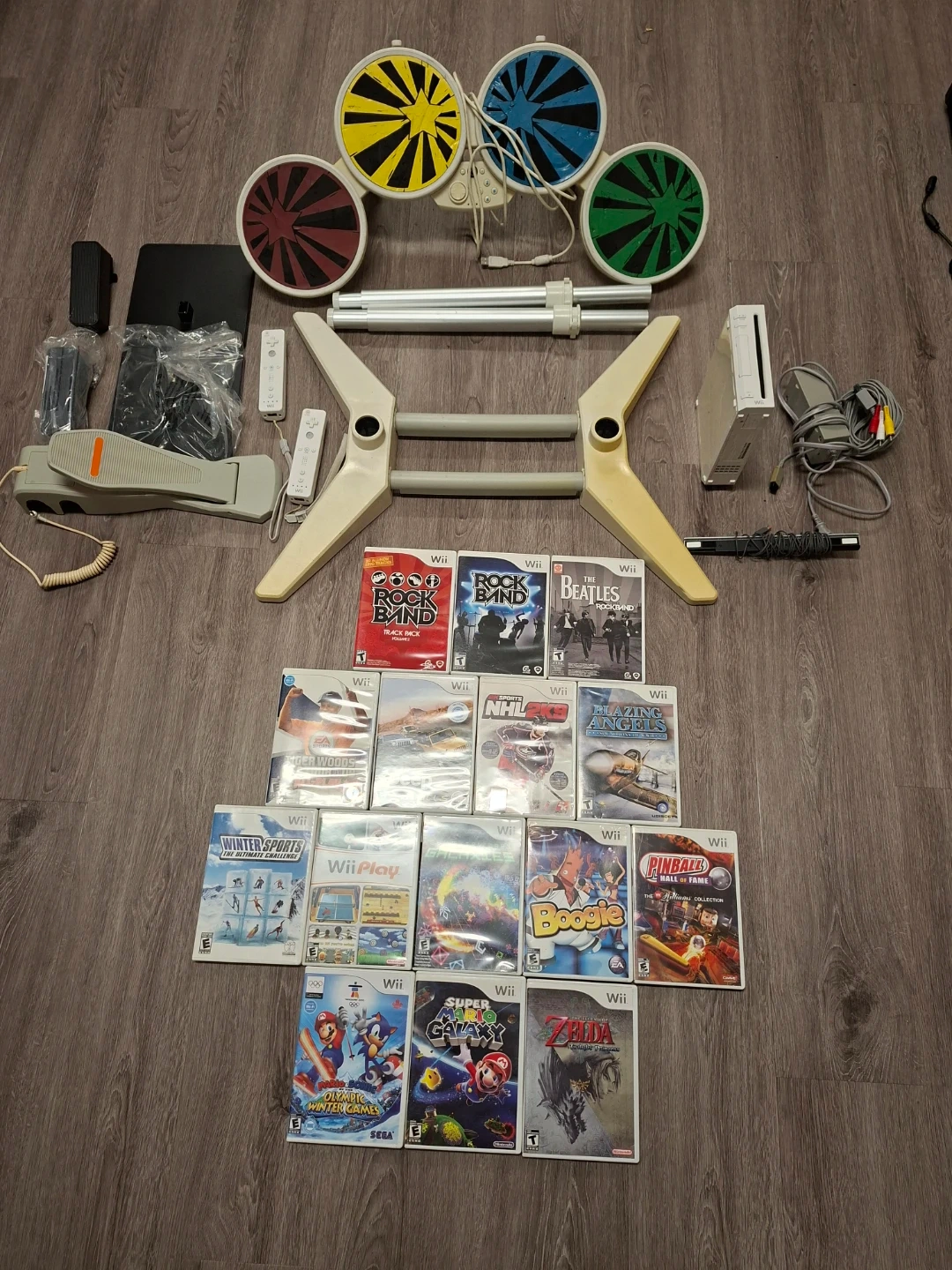 Used for lesd than a month. Complete Nintendo Wii console bundle including the console, controllers, and multiple games like Rock Band and Guitar Hero. It also includes a drum set and pedal for an immersive gaming experience. This setup is ready for hours of fun!