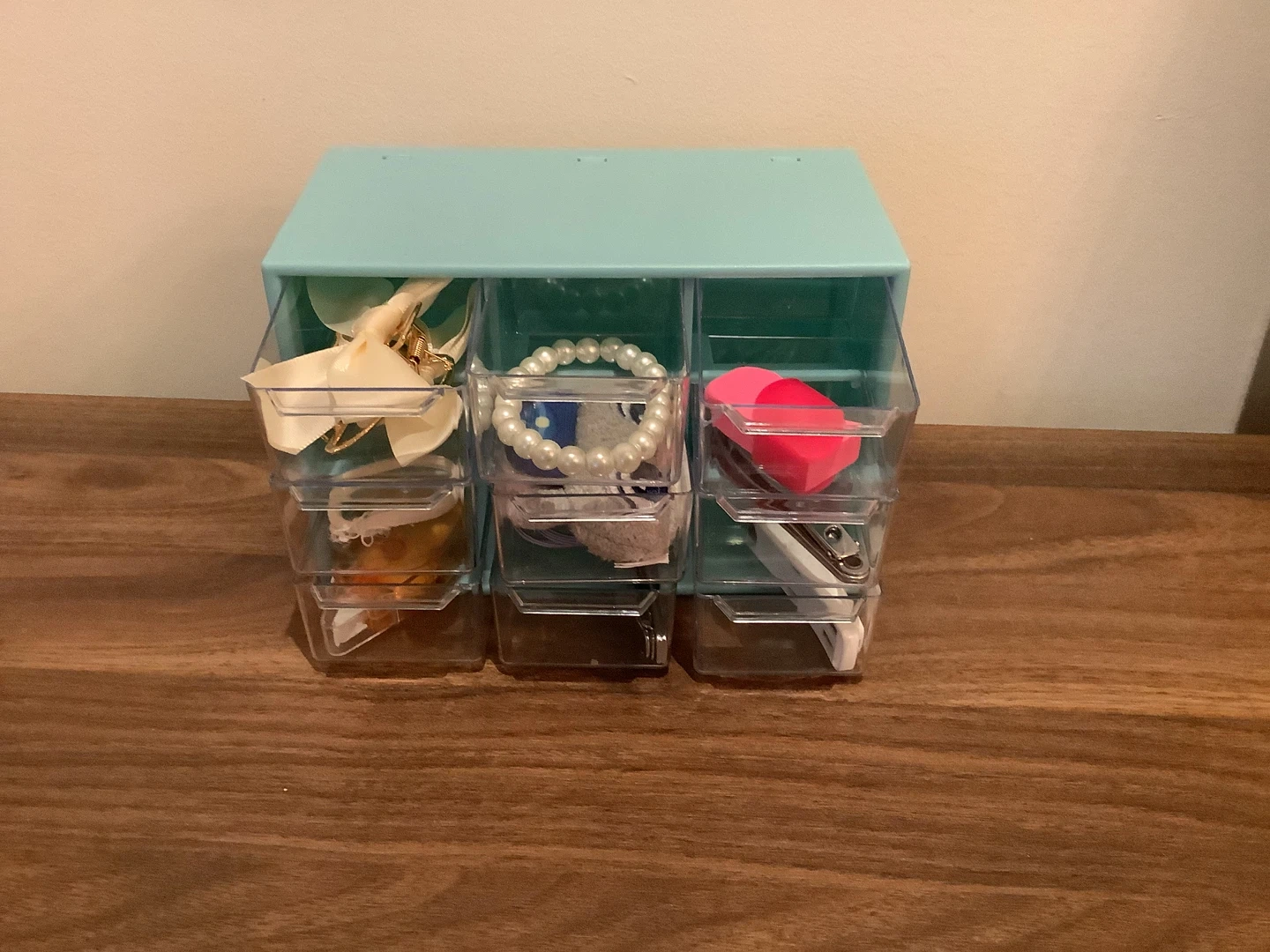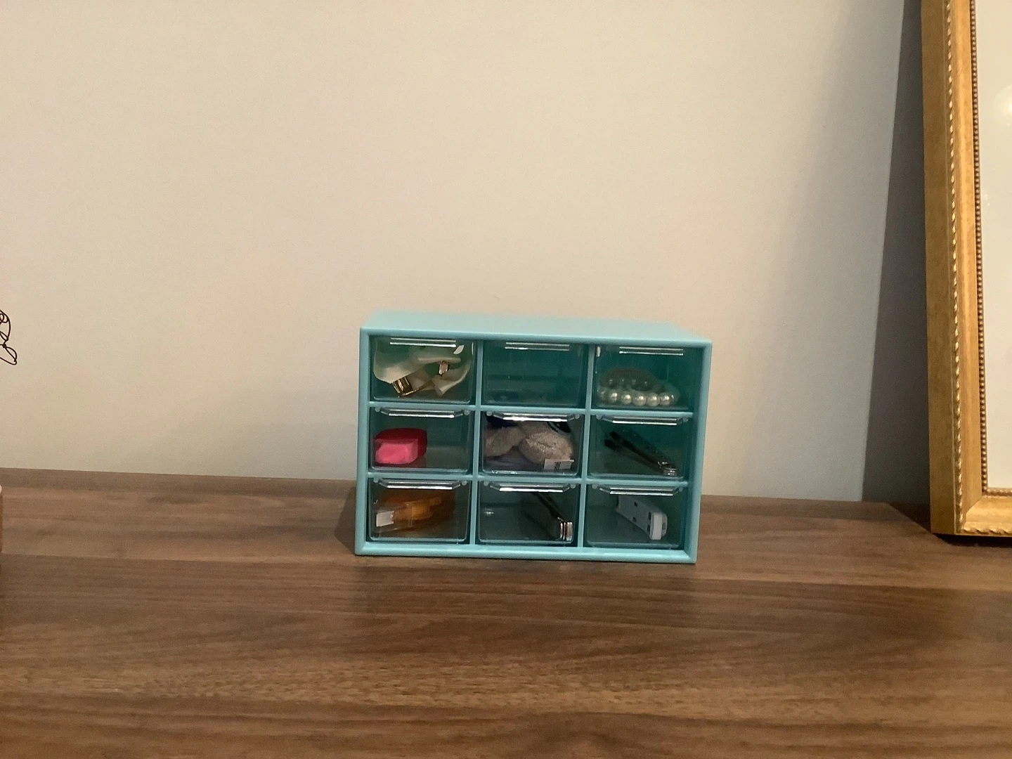 This light blue organizer has nine clear drawers, perfect for small items. Plastic material. It's great for keeping craft supplies or jewelry tidy. This would be useful for anyone needing extra storage. Easy to access and great for desktop storage.