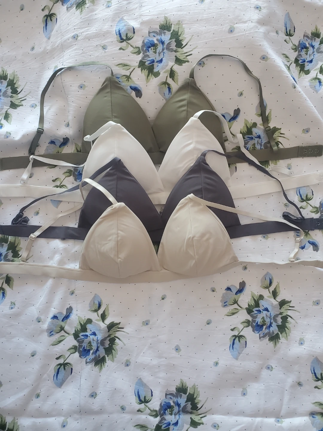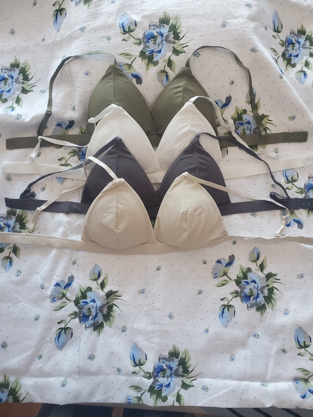 Four bralettes in assorted colours: olive green, white, charcoal grey, and beige. Made of a soft, stretchy material for comfort. Adjustable straps and band for a custom fit. These are wireless bralettes