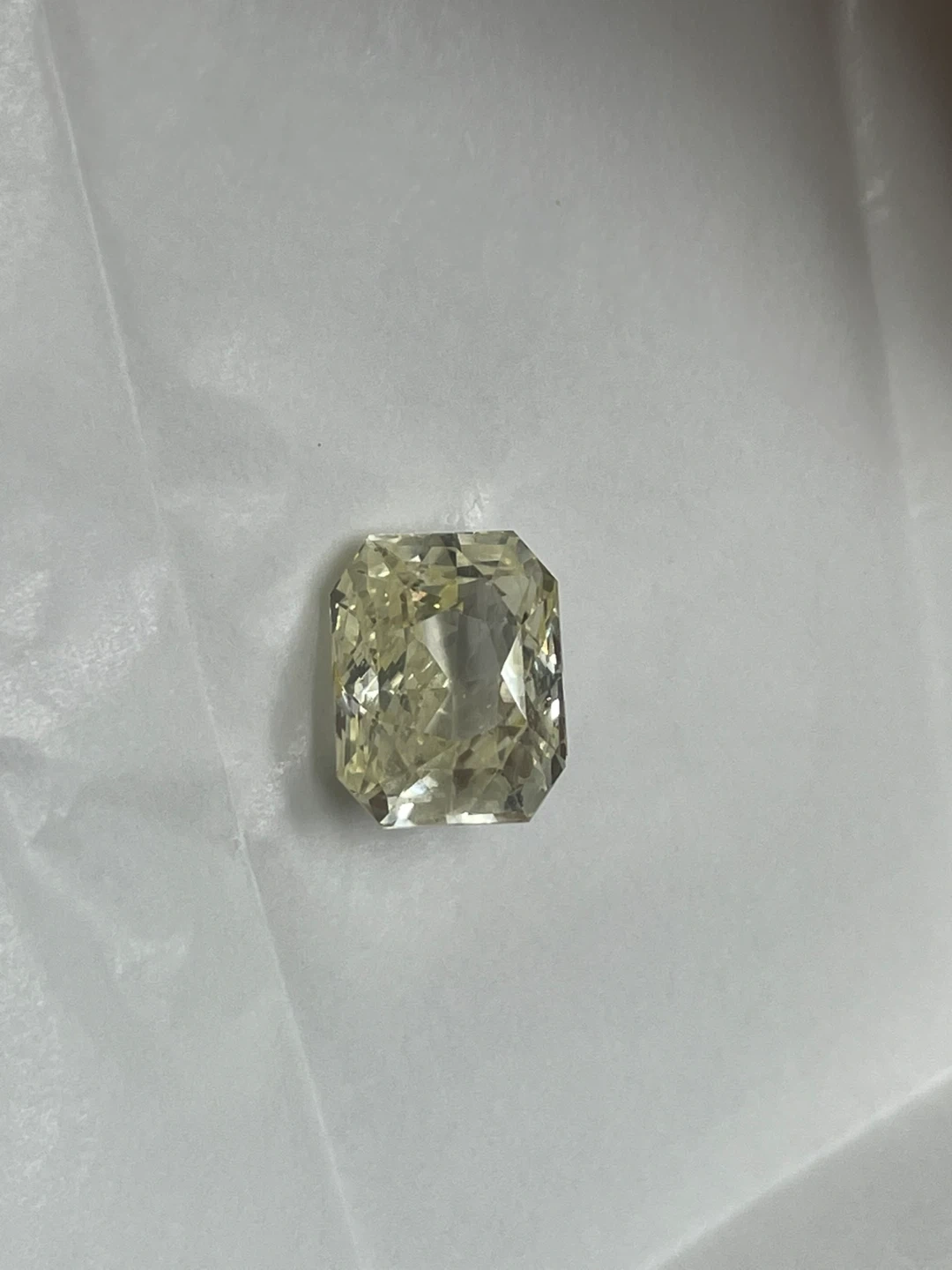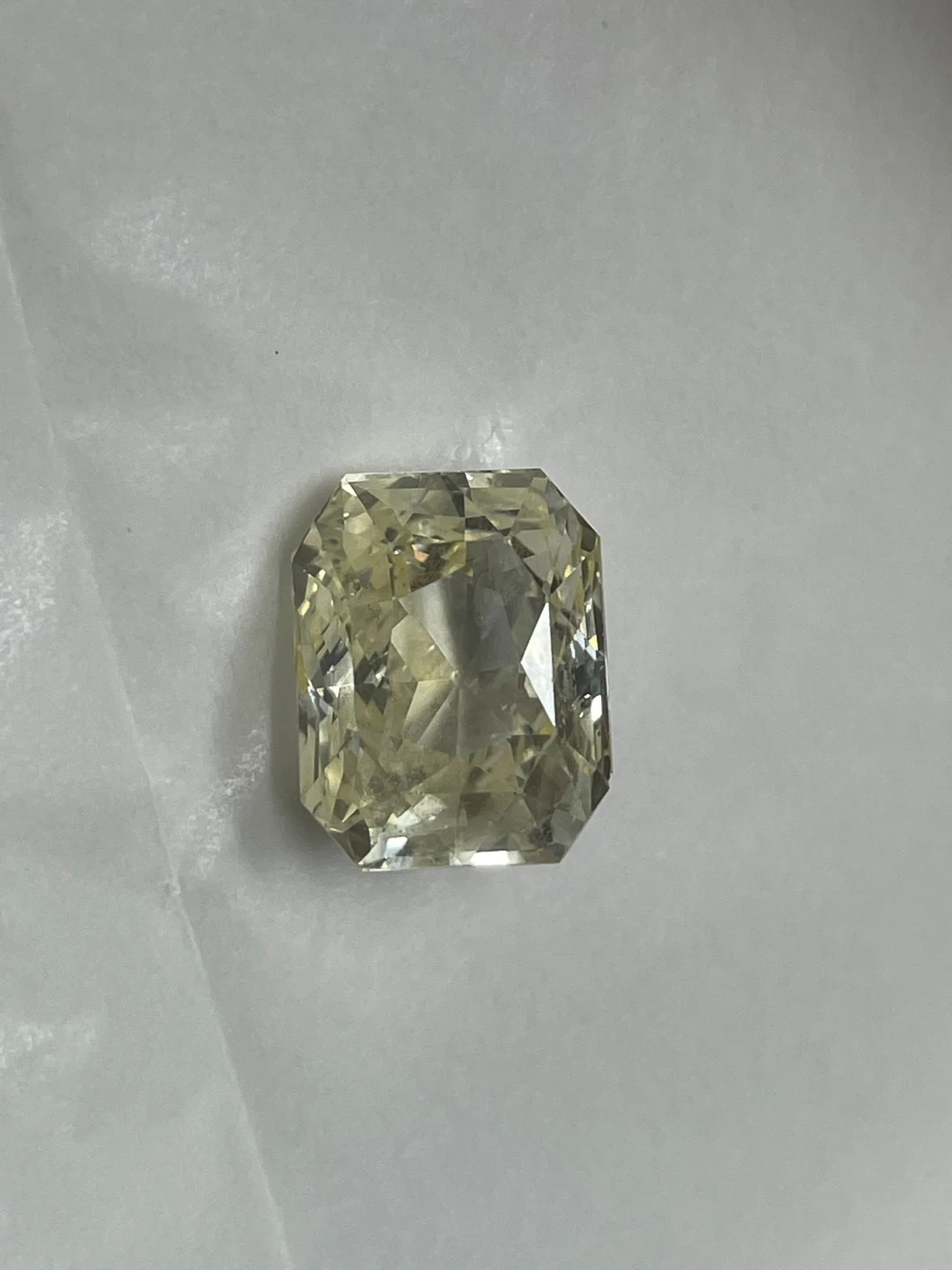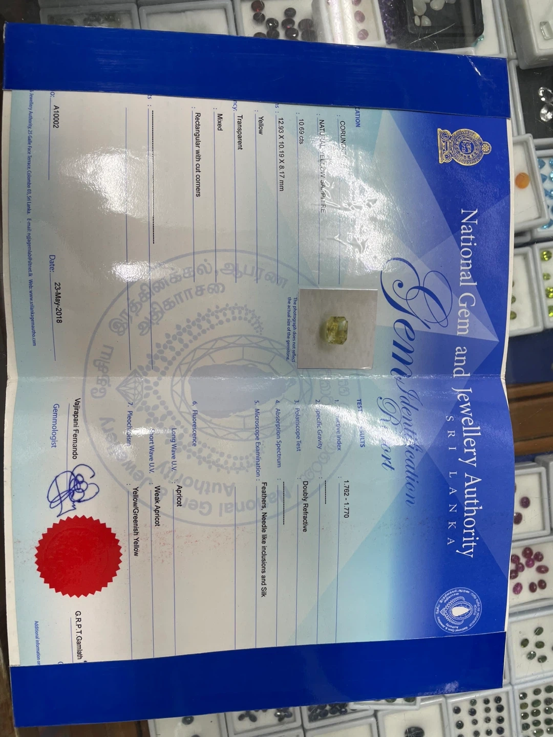 A radiant cut yellow Shappire gemstone weighing 10’69 carats, Unheated , with dimensions of 12.50 x 10.88 x 8.17 mm. It's described as transparent with rectangular with cut corners. This gem was certified by the National Gem and Jewellery Authority in Sri Lanka on 23 May 2019.