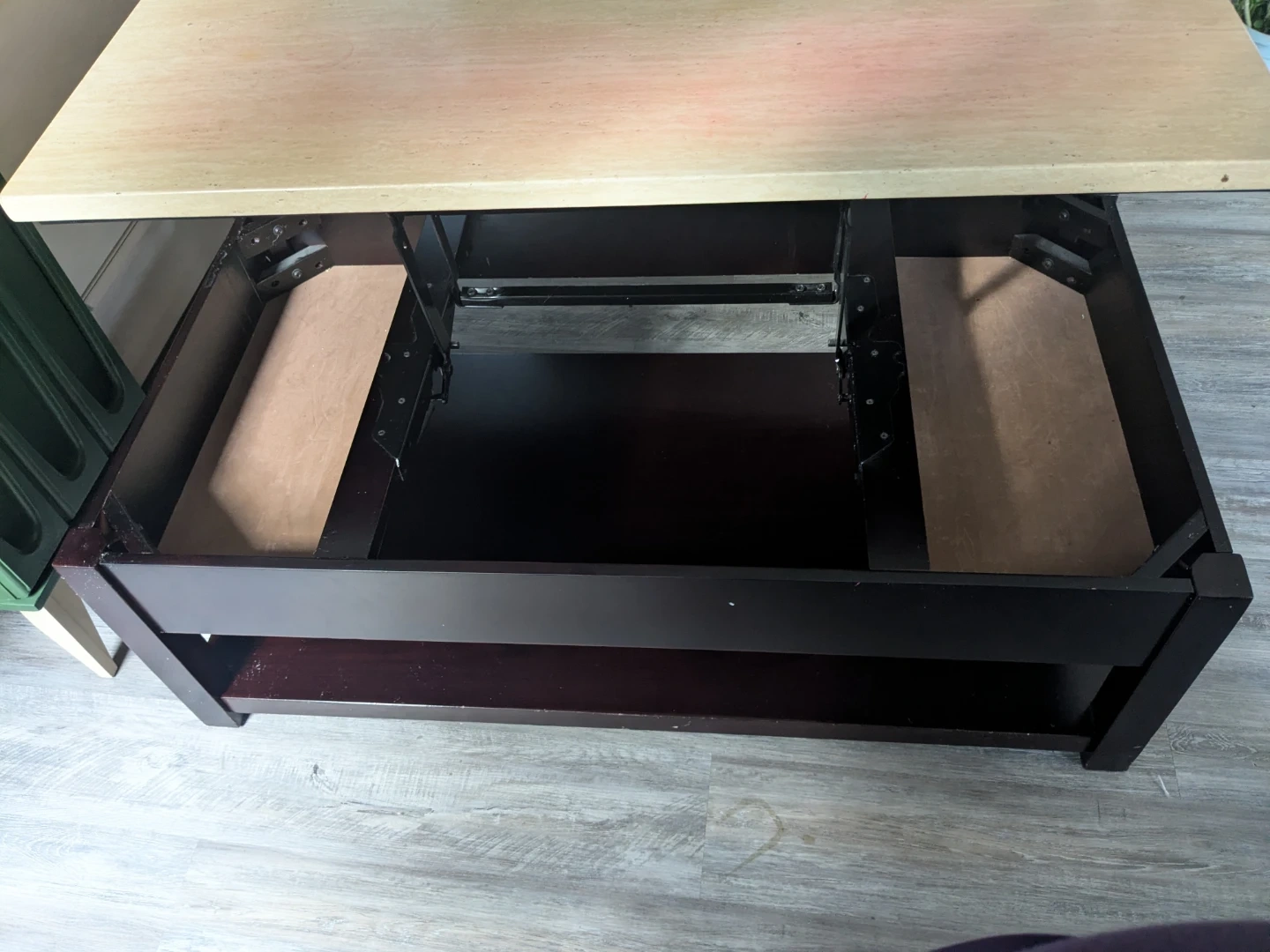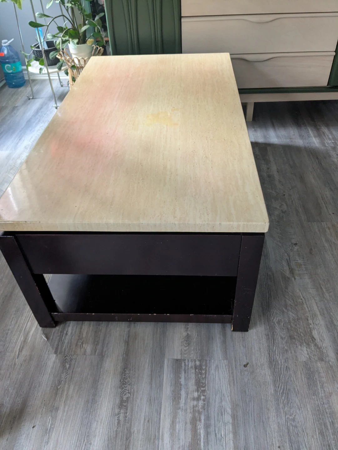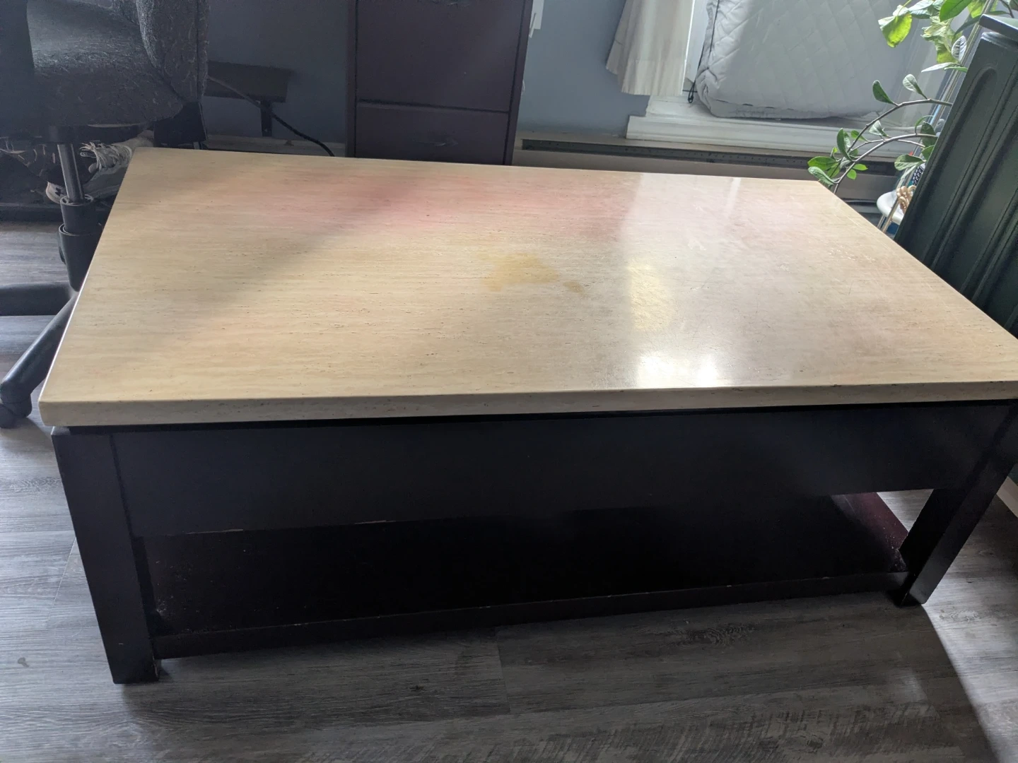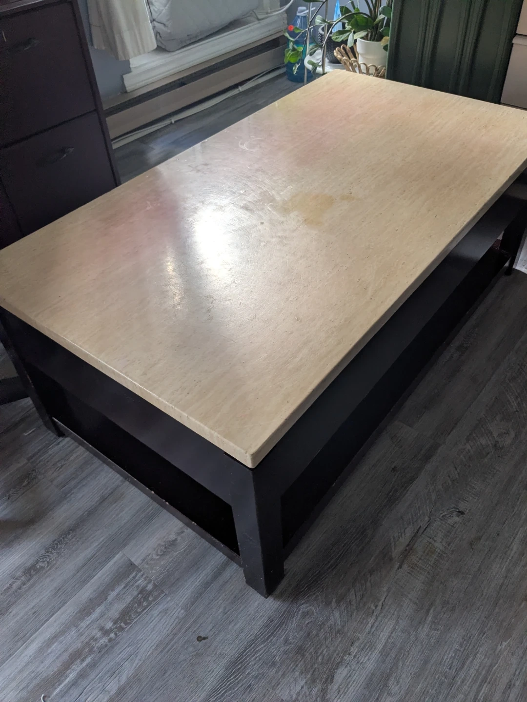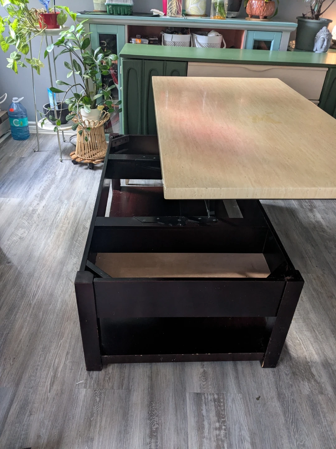 Selling a coffee table with a lift top. It has a dark brown base and a light-coloured top. The lift top reveals storage space inside, which is super handy! It's in good condition and ready for a new home.