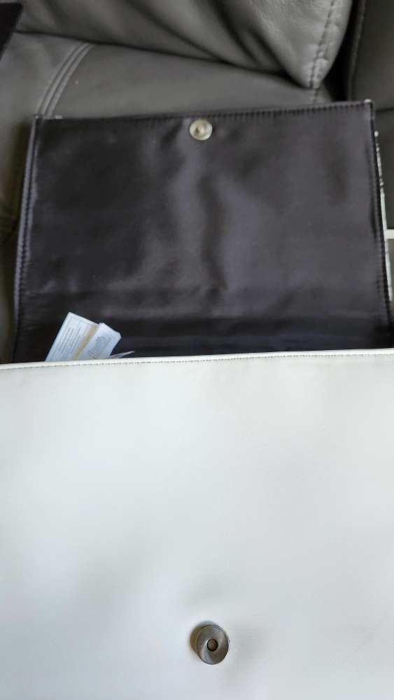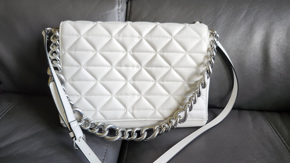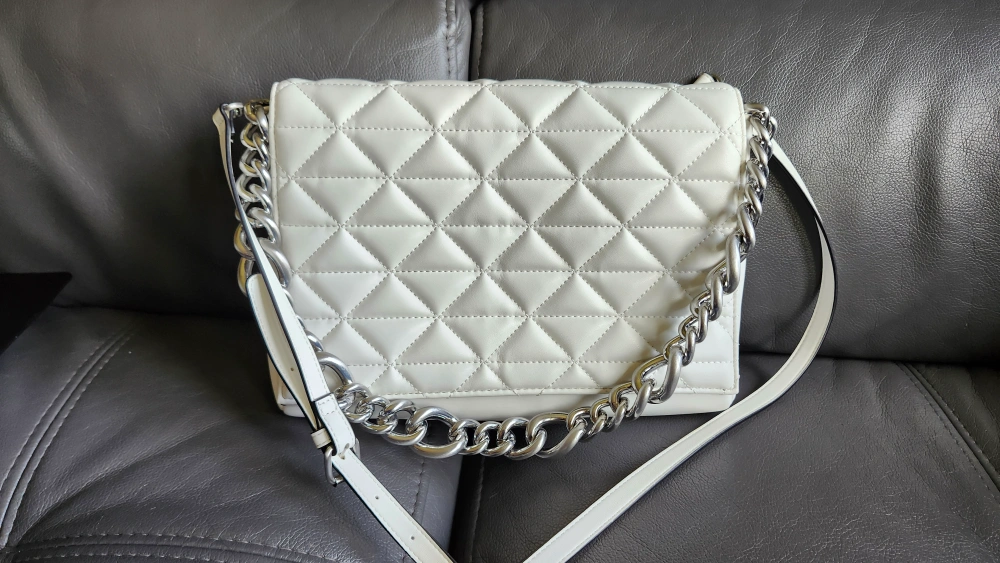White quilted chain bag with a silver chain strap. The bag has a flap closure and a zippered pocket inside. The bag has a black lining.