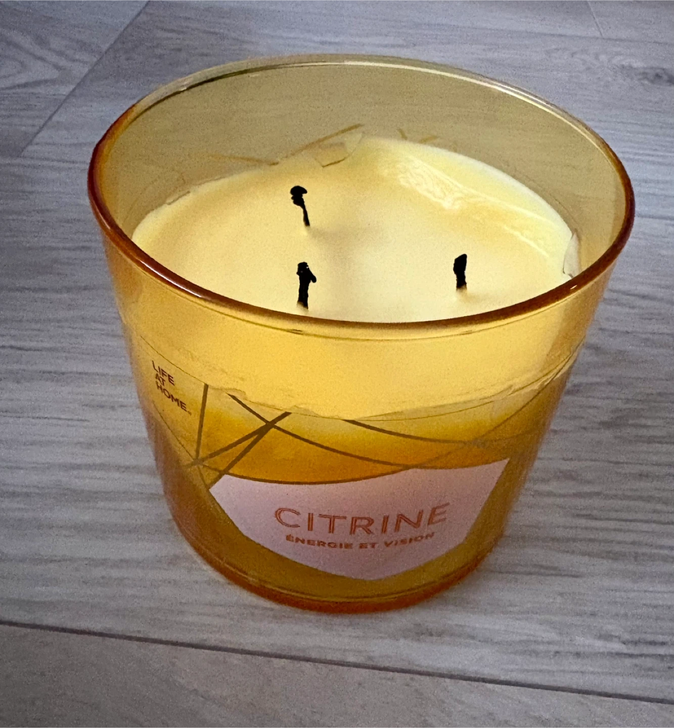 This is a Life At Home Citrine scented candle. It's a 3-wick candle with soy blend wax.