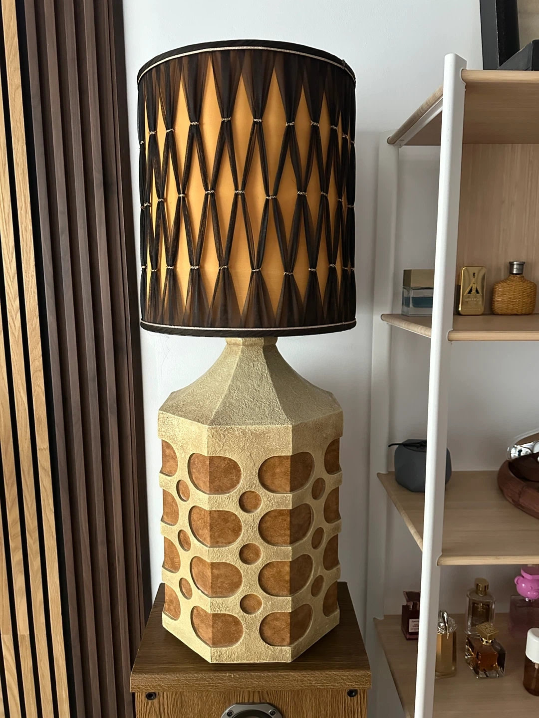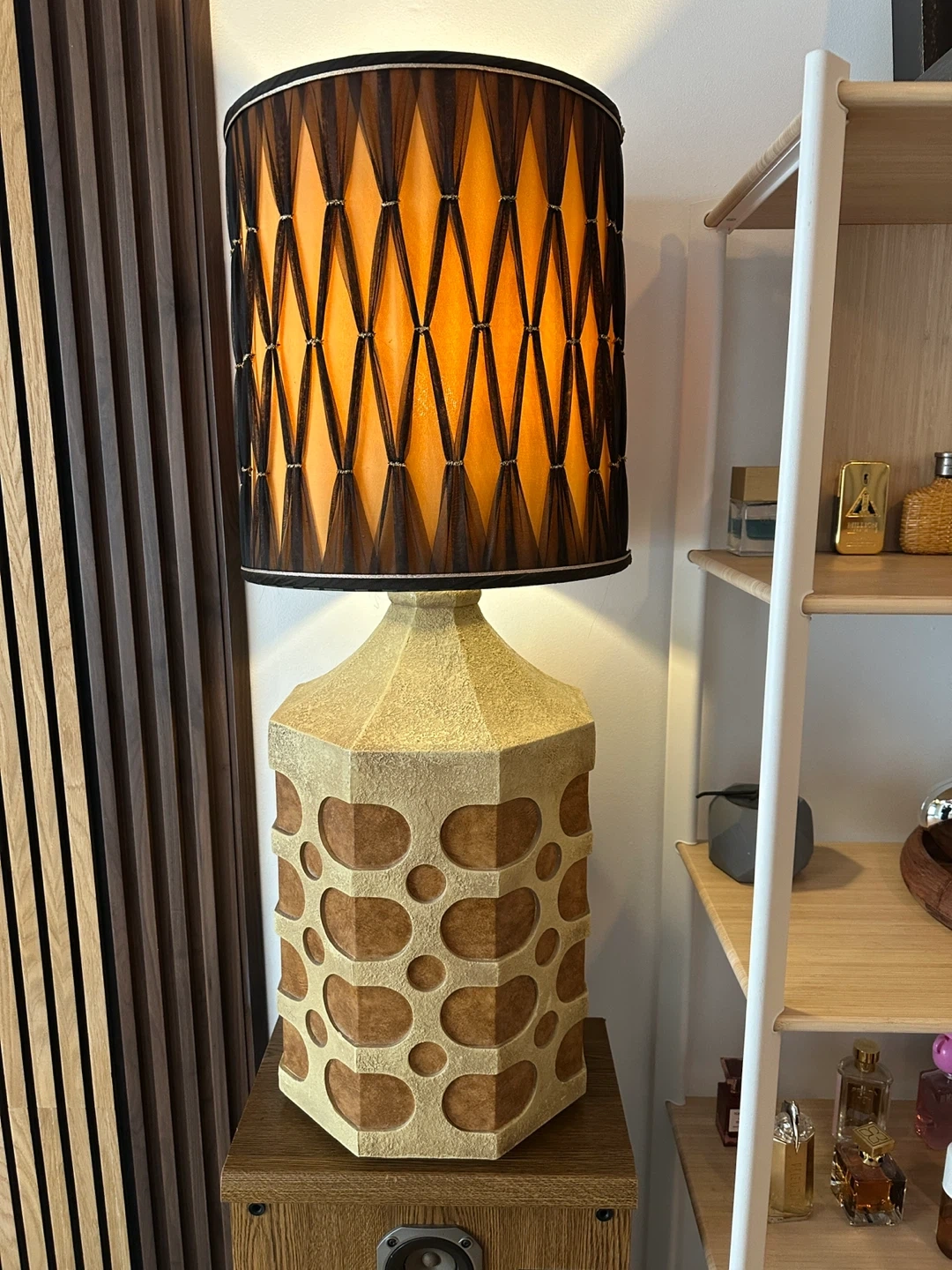 A spectacular oversized giant brutalist table lamp with fantastic shade. Perfect working order. Note: theres one chip at back of lamp that is essentially neglible in terms of visibility but nonethless price is reduced accordingly. Otherwise mint condition. Wow!