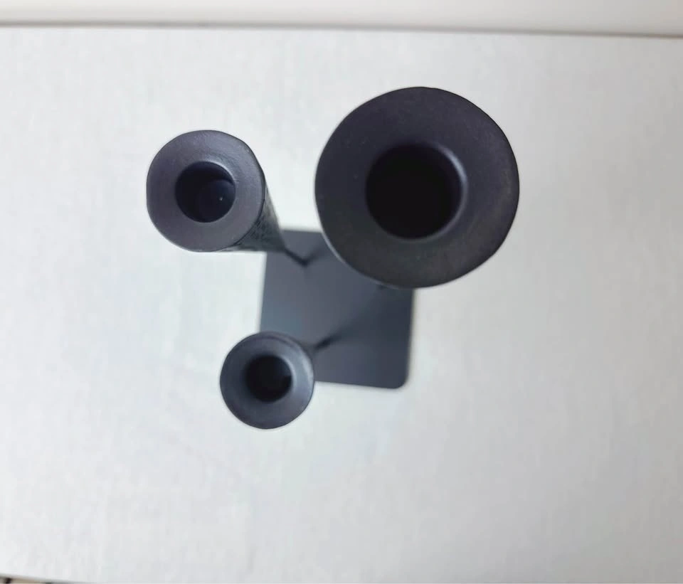 3 Stationary Cylinder Candle Holders On A Square Base. Mid-Century Modern Brutalist Style. Textured/Dimpled Bronze/Brown Metal. Very Unique. Great condition - no damage to note. Approximately: 18", 14.5" & 12" holders. Base is a 6" square.