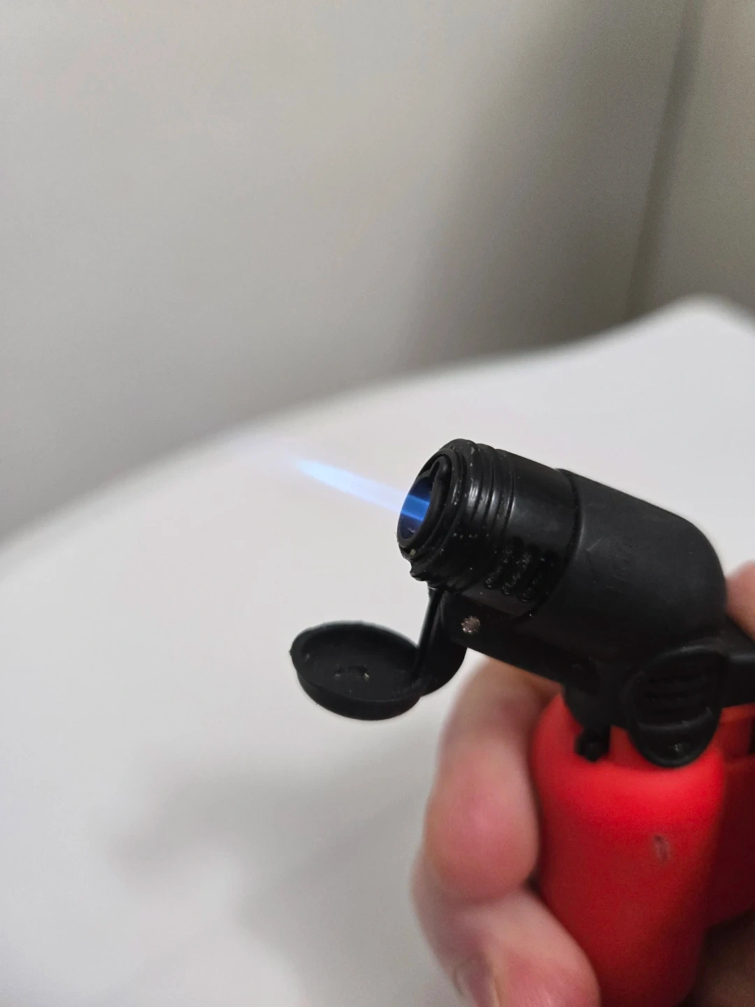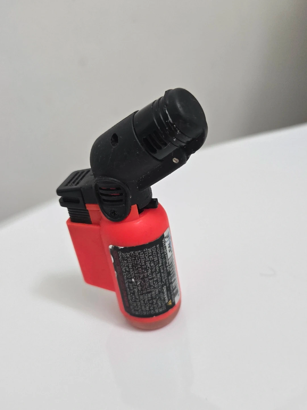 This is a butane torch lighter with a red fuel tank and a black nozzle. It features a flip-top lid to protect the nozzle. The flame is adjustable and produces a strong jet of blue fire. Perfect for lighting candles or for use in the kitchen!