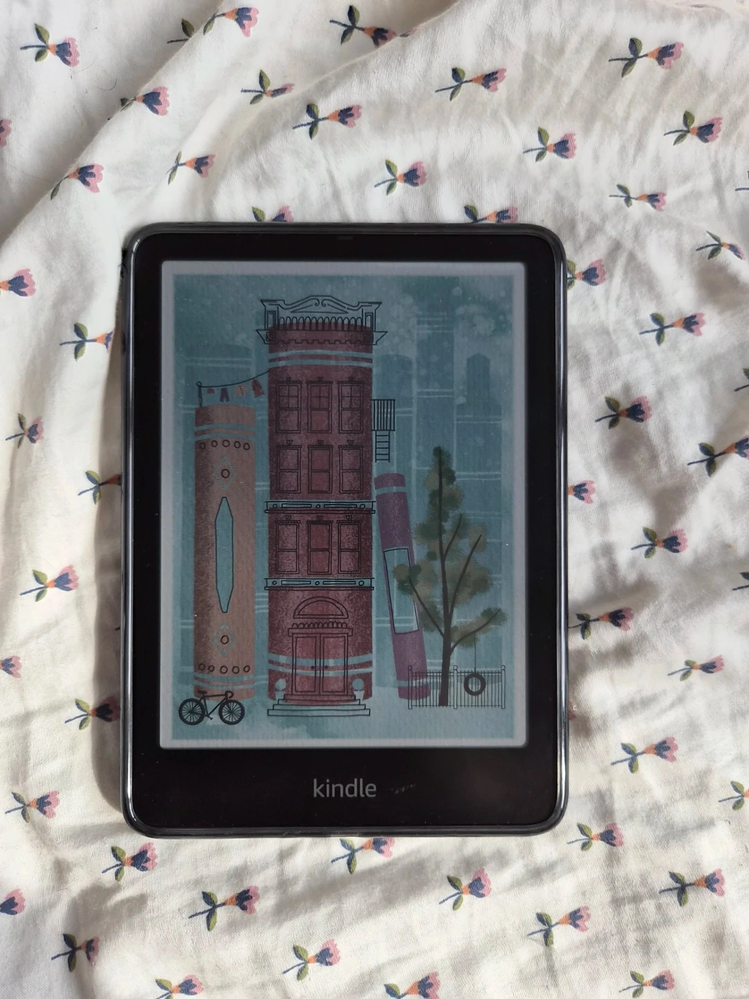 Amazon Kindle e-reader with a black protective case featuring a celestial moon and moth design. The case has a decorative floral vine pattern. It's lightweight and portable for reading on the go. Perfect for book lovers!