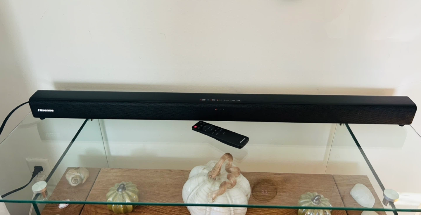 This is a Hisense HS205 2.0 Channel Sound Bar Home Theater System. It's a black soundbar with a remote. Includes USB power.