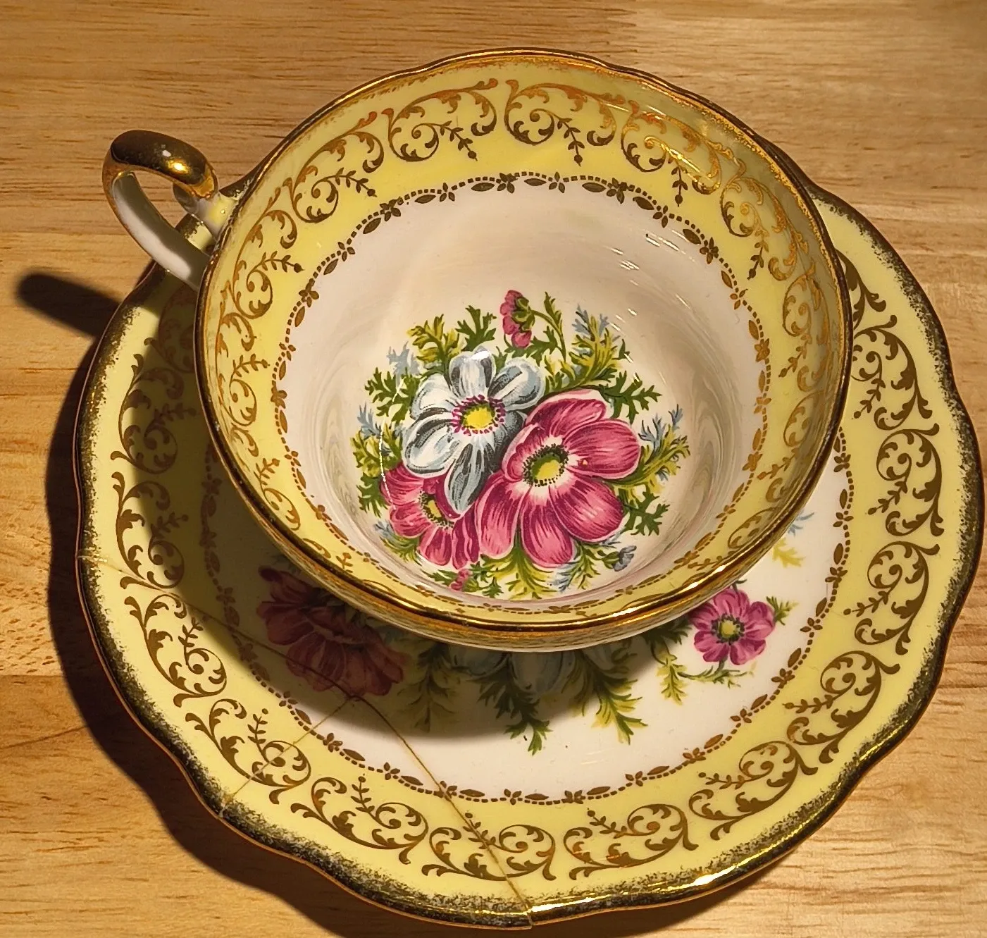 A lovely yellow tea cup and saucer set by Foley, made in England. It's decorated with a floral pattern and gold trim. This set is perfect for enjoying your favourite tea.