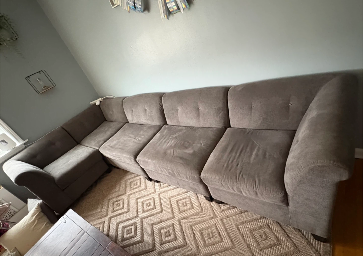 This sectional sofa offers ample seating space with its modular design. It's upholstered in a durable gray fabric. The sofa features comfortable cushions with tufting on the backrests. Perfect for large living areas or family rooms!