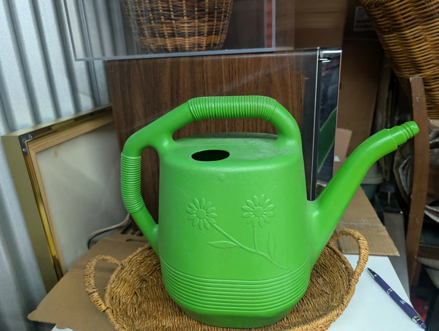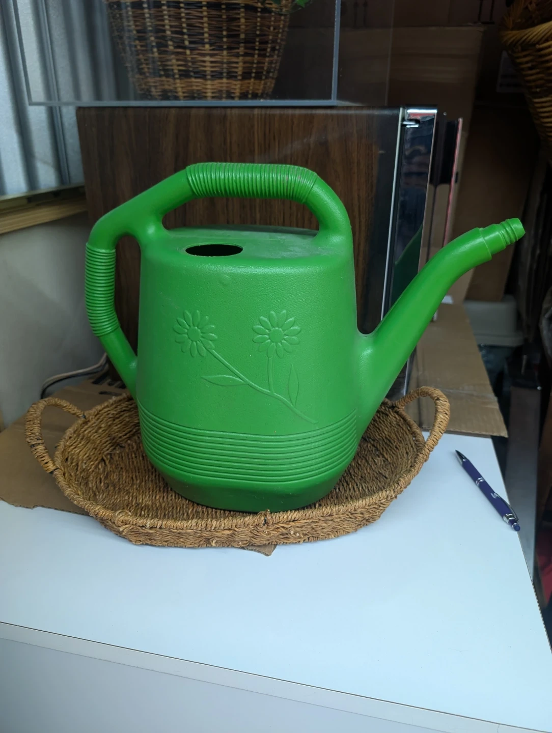 This green watering can has a cheerful floral design embossed on the front. It's made of durable plastic with a comfortable handle and a long spout for easy watering. Perfect for keeping your houseplants or garden thriving!