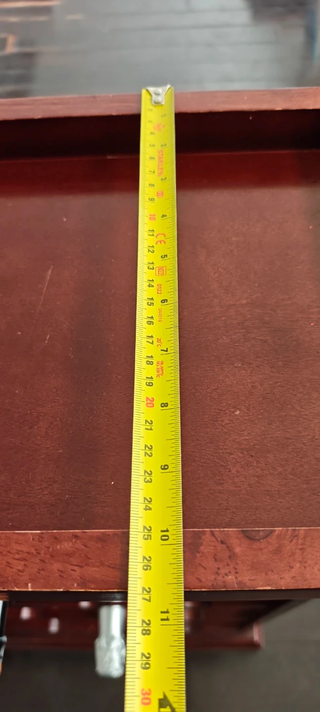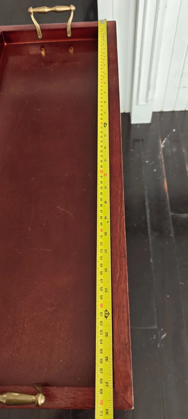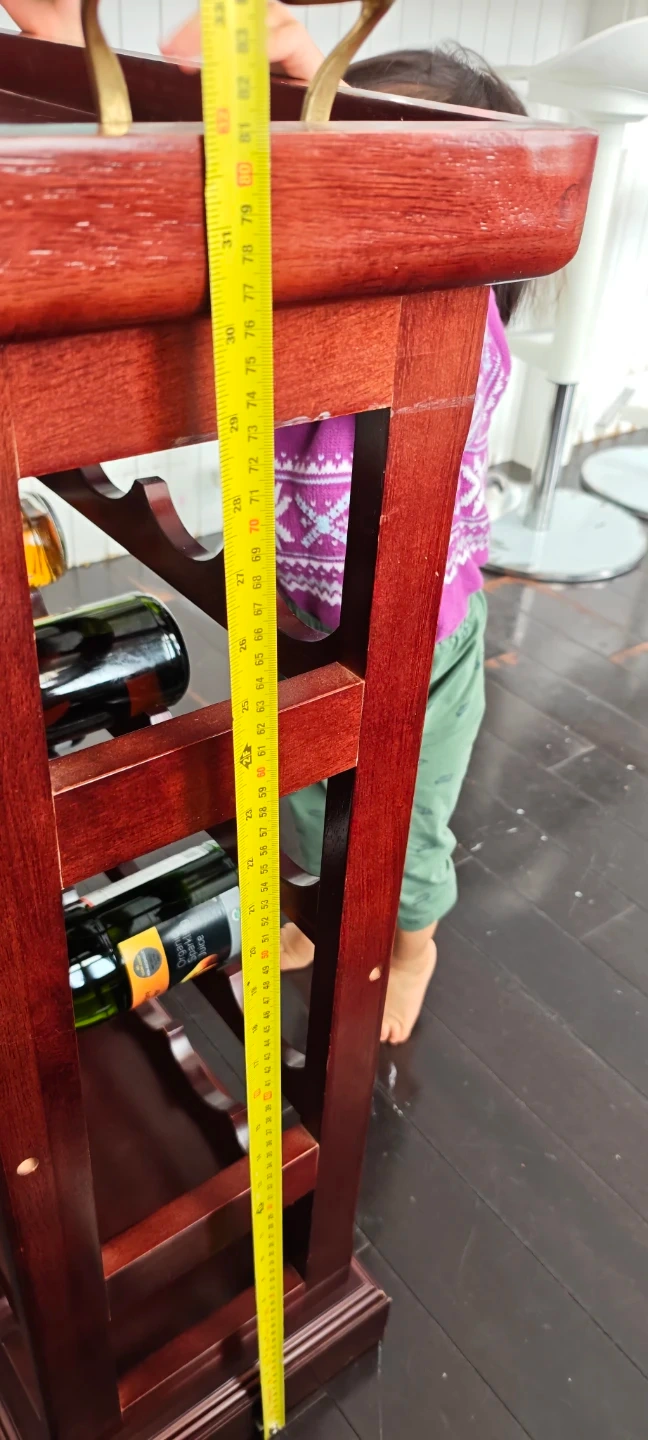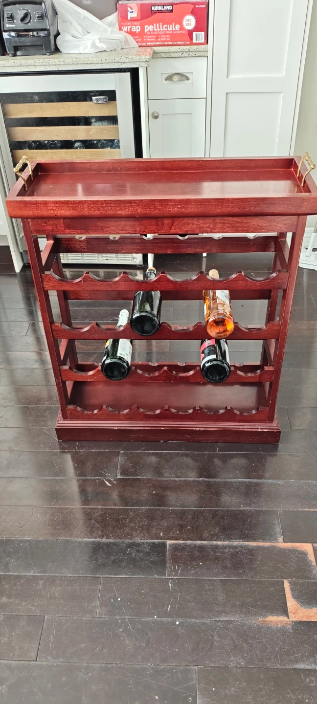 This is a dark red wooden wine rack with a tray top and two handles. It has five shelves designed to hold multiple bottles of wine, with a flat surface on the very top. It's perfect for storing your wine collection in a stylish way.