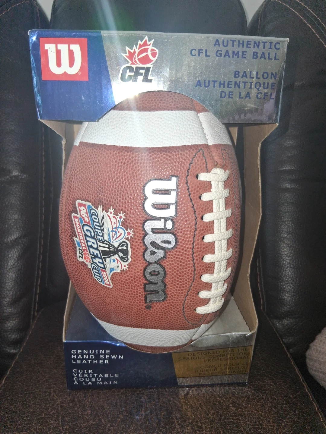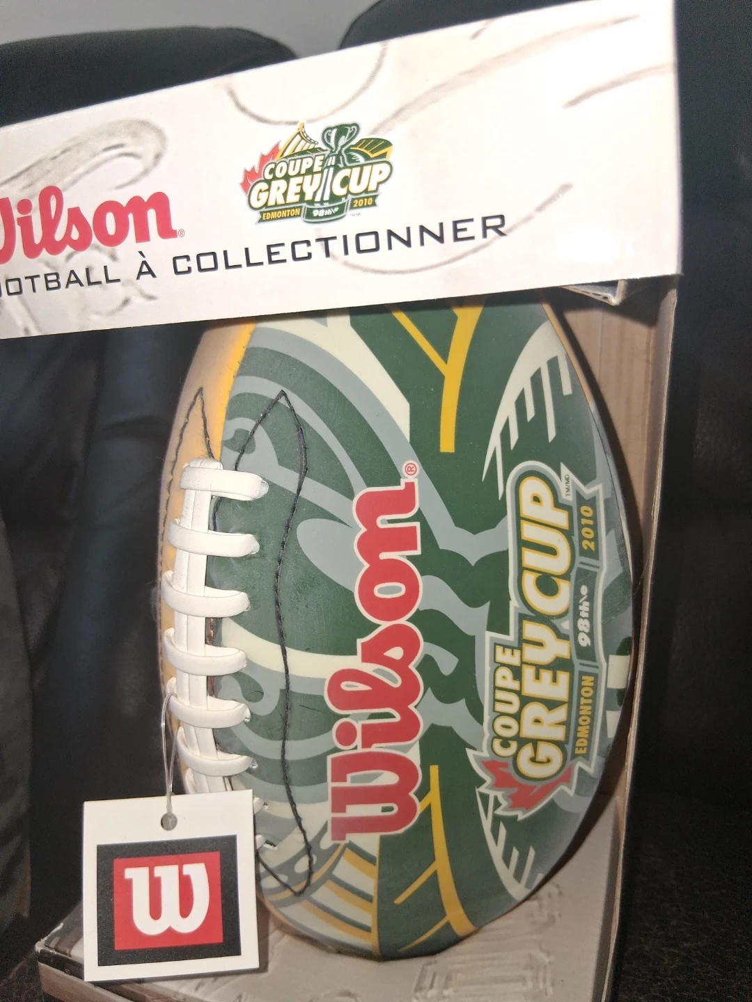 Authentic CFL game ball by Wilson. This is a collector's edition commemorating the 2010 Grey Cup in Edmonton. Genuine hand-sewn leather construction. Never played with