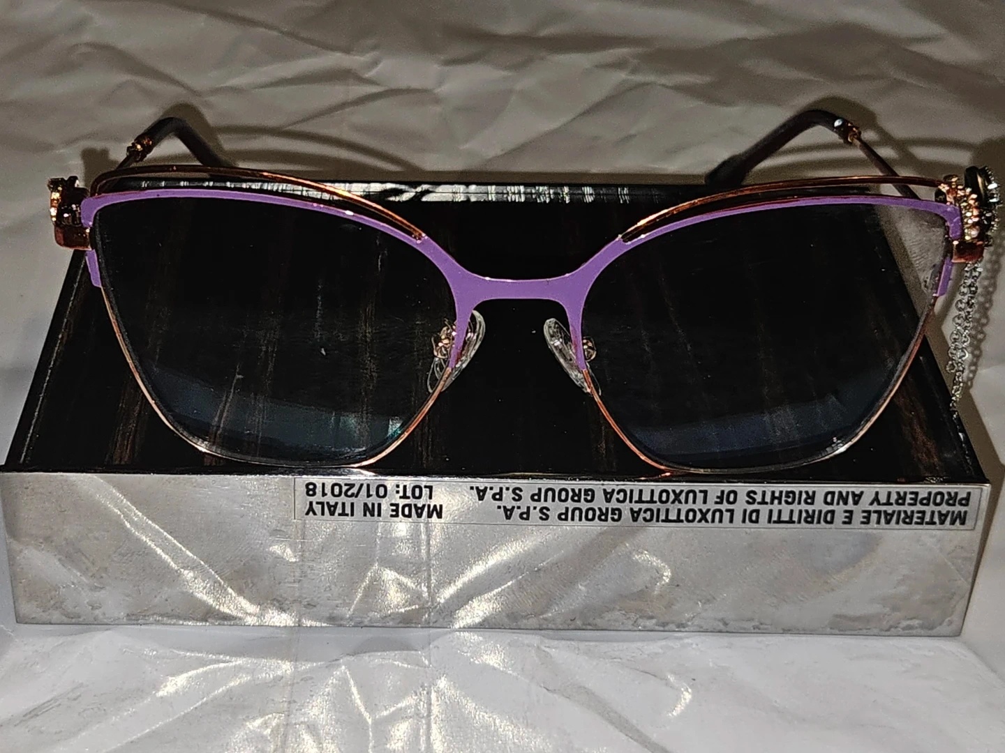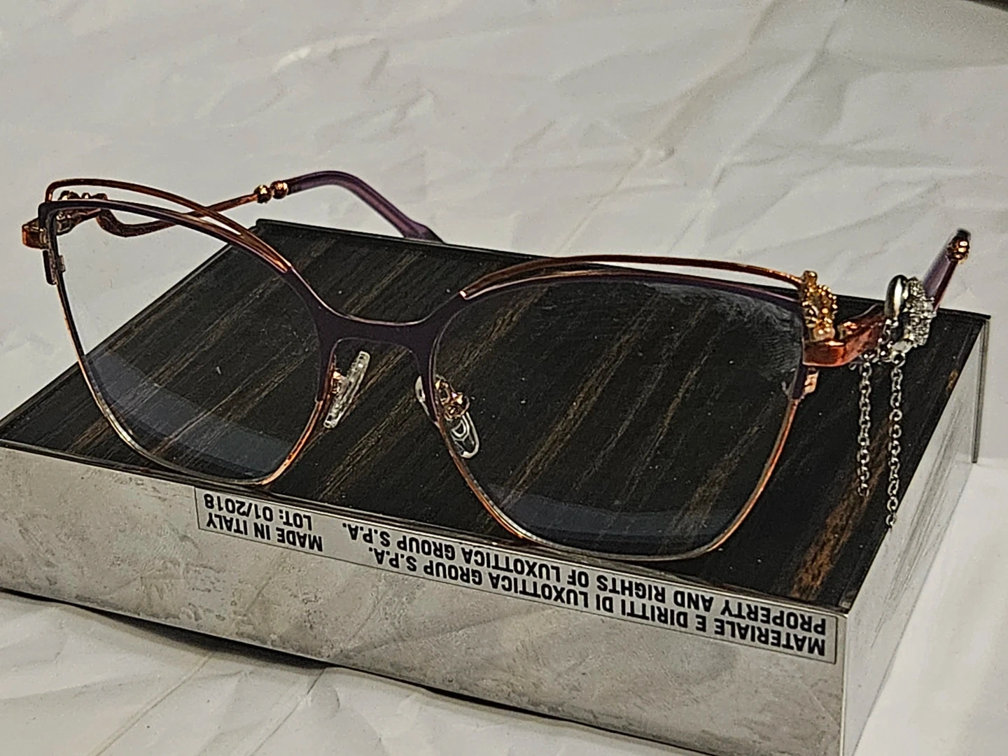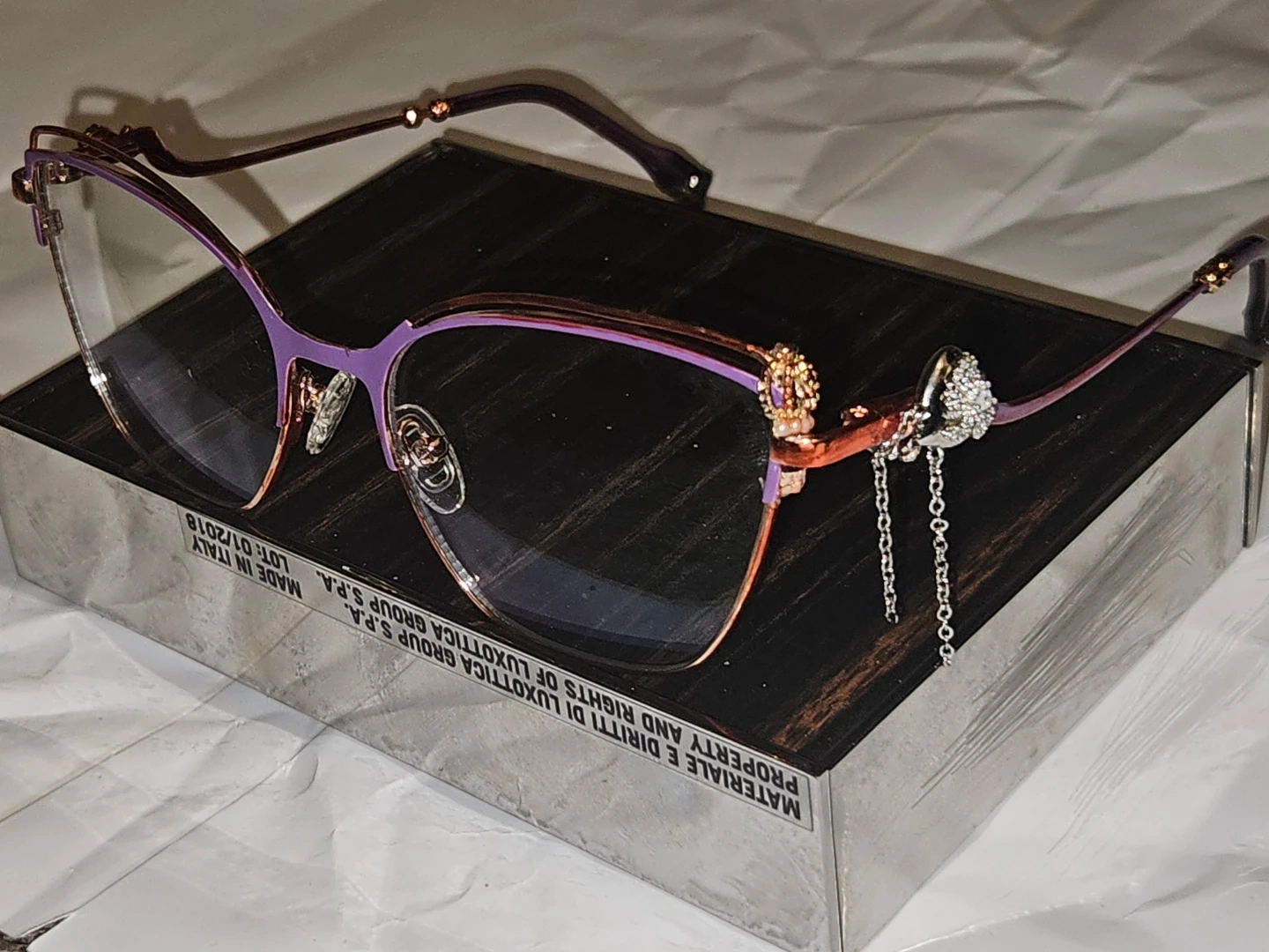 Stylish eyeglasses with a unique cat-eye shape and a decorative rhinestone charm on the temple. The frames are a lovely combination of purple and rose gold. Made in Italy.