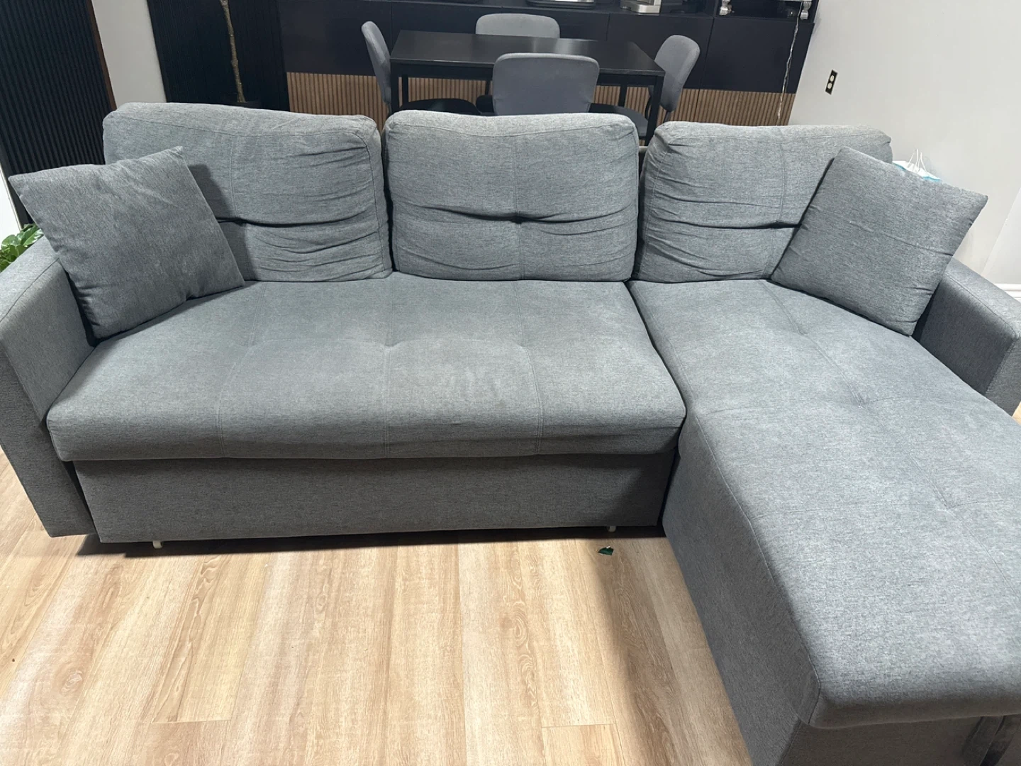 This grey sectional sofa easily converts into a bed, offering a great sleeping solution. It also features convenient storage space underneath. The material is a durable fabric, and it comes with matching throw pillows.