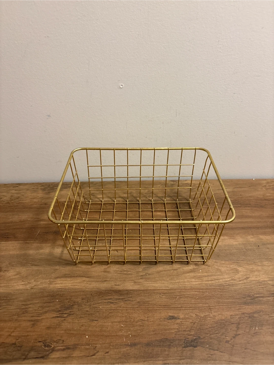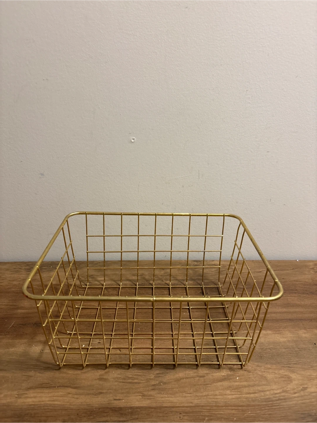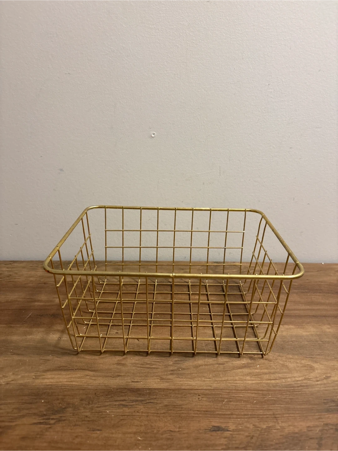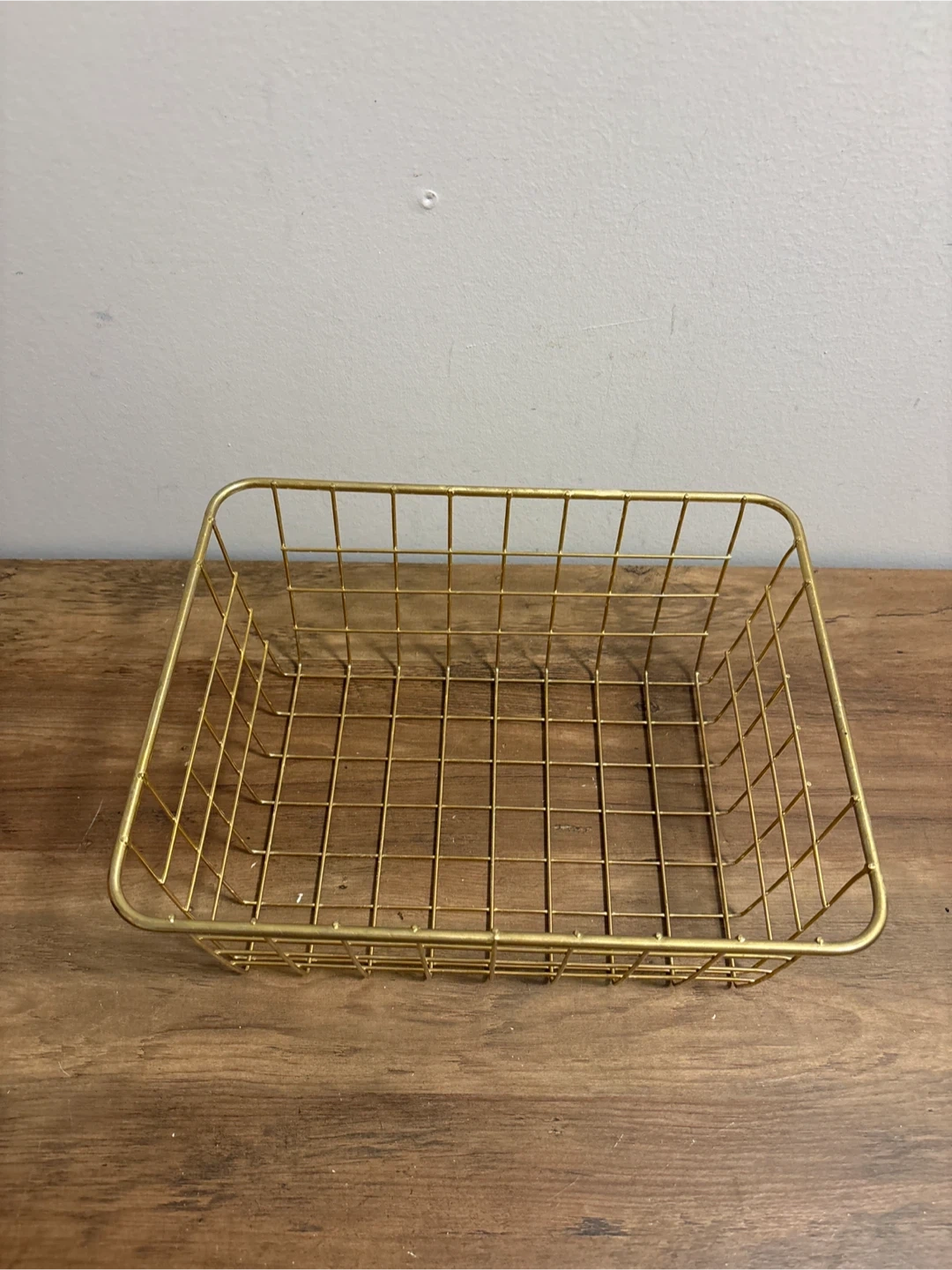 This gold wire basket is a handy organizer. It's made of metal wire with a grid pattern. It would be useful for storing small items on shelves or countertops.