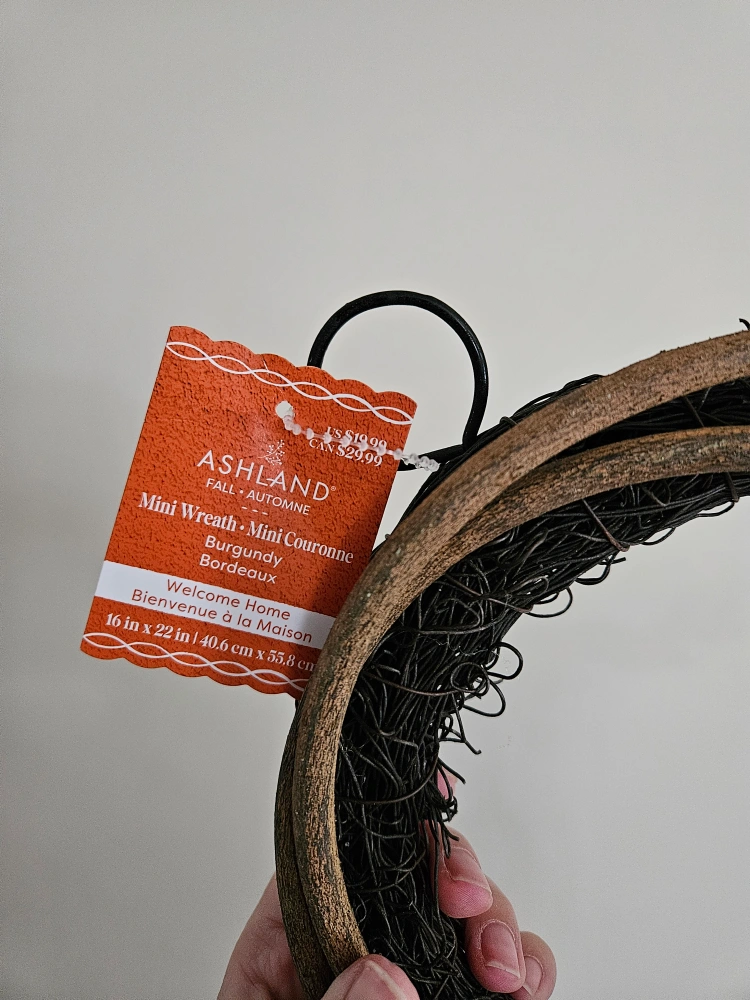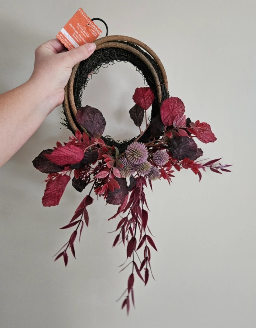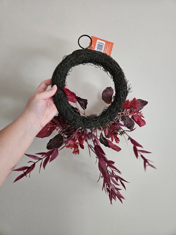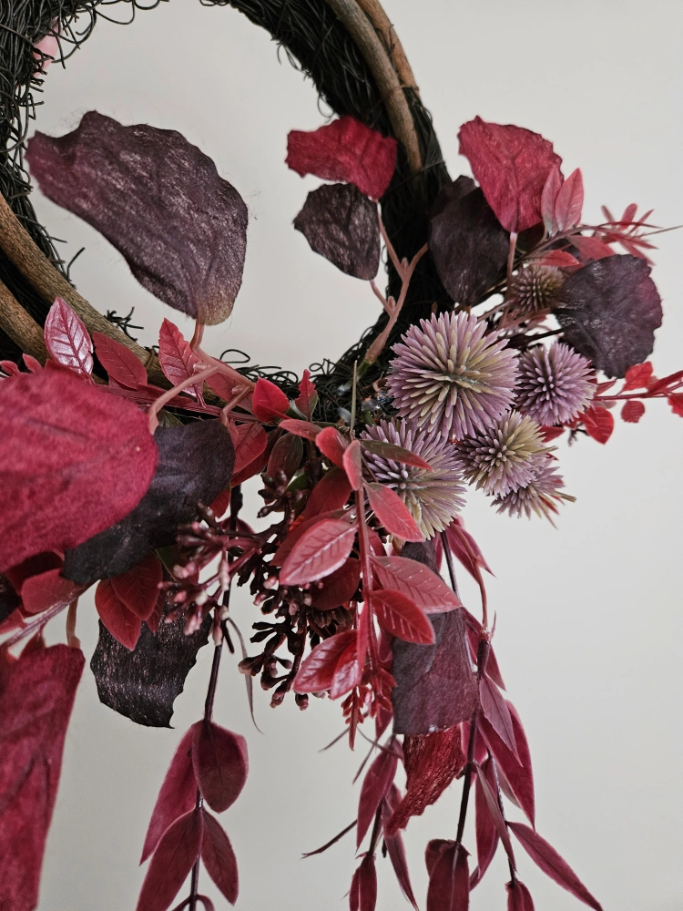 Miniature autumnal wreath. Burgundy and deep red faux florals. Wire base. Perfect for fall decorating. New with tag, retails for $29.99