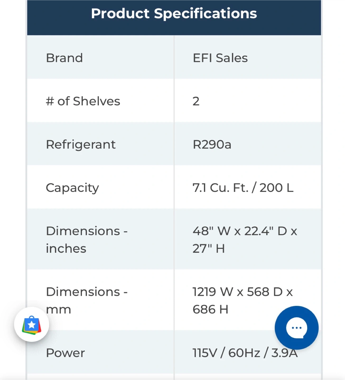 EFI Sales 48” refrigerated countertop display case. Features a stainless steel exterior and interior with a black frame. Storage volume is 200L, and it uses R290 refrigerant. Includes two LED lights and two stainless steel shelves. Manufactured in China.