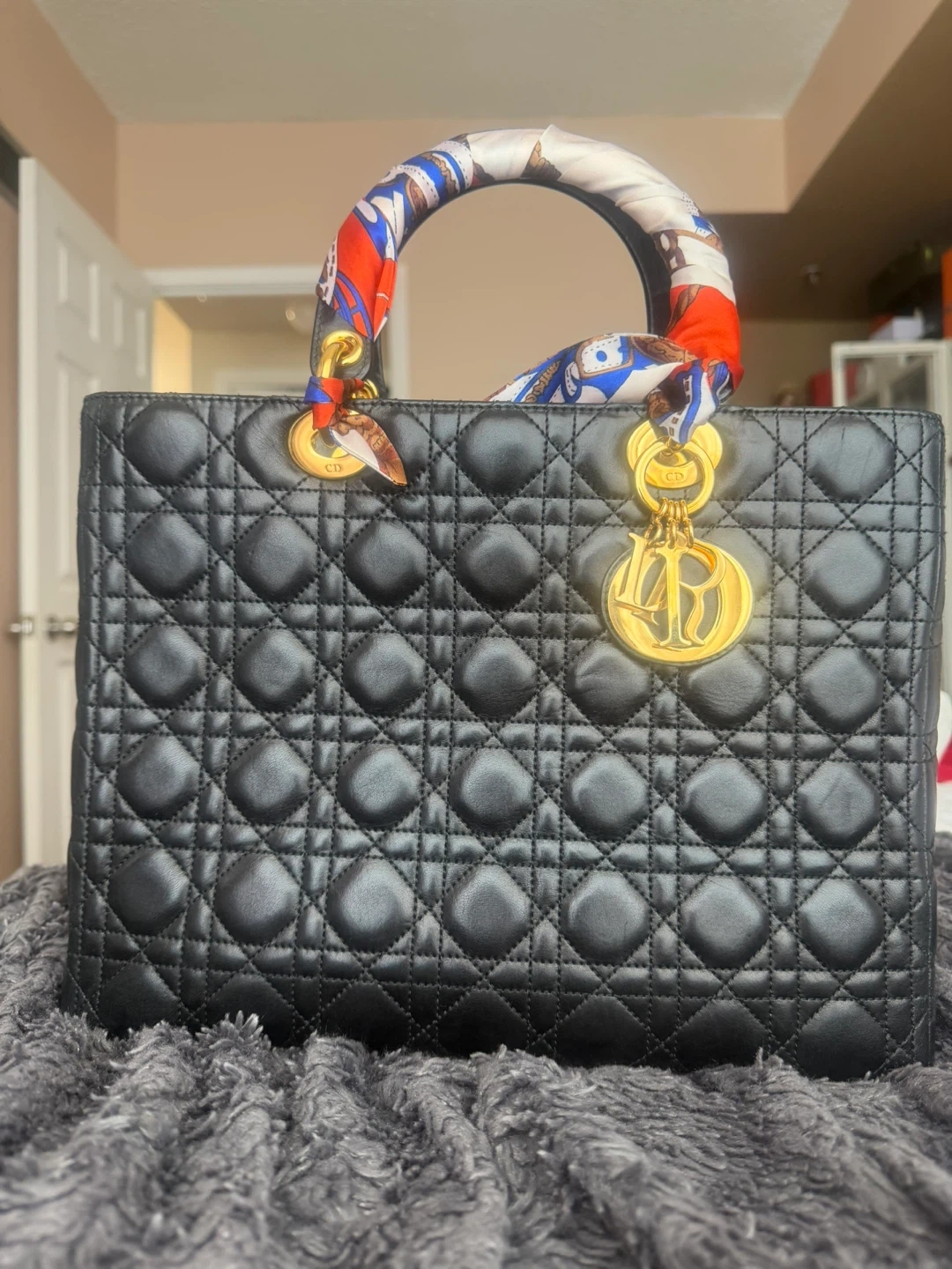 Classic black quilted leather Lady Dior handbag with gold-tone hardware and scarf accent on the handle. Includes authenticity card & dustbag with no sling.Lamb skin.