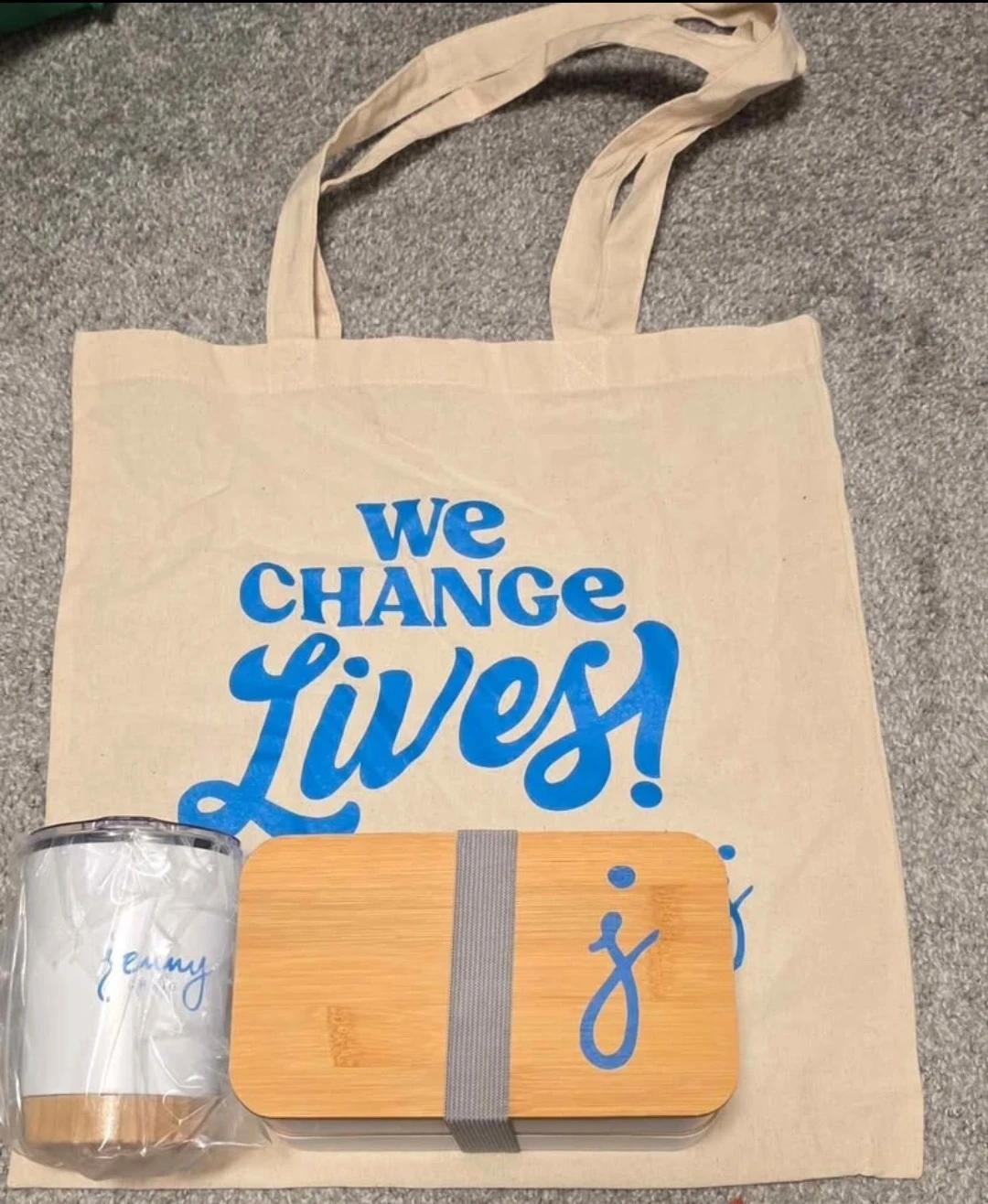 This set includes a "We Change Lives!" tote bag, a white tumbler with "jenny" personalization, and a bamboo lunch box with a grey strap. It's a convenient collection for everyday use. This set is useful for carrying daily essentials or for packing meals on the go.