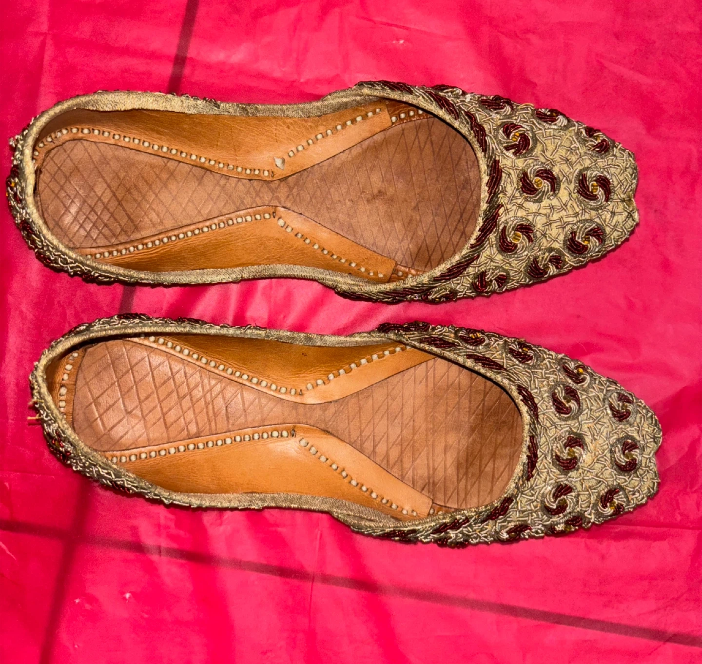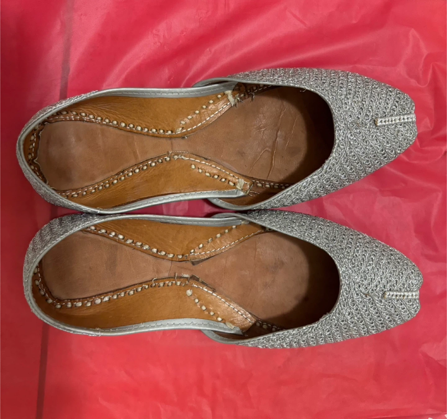 These are a pair of handmade ethnic slippers. They are in good condition and would be perfect for party/wedding wear! They are silver and gold/red. Each $20.