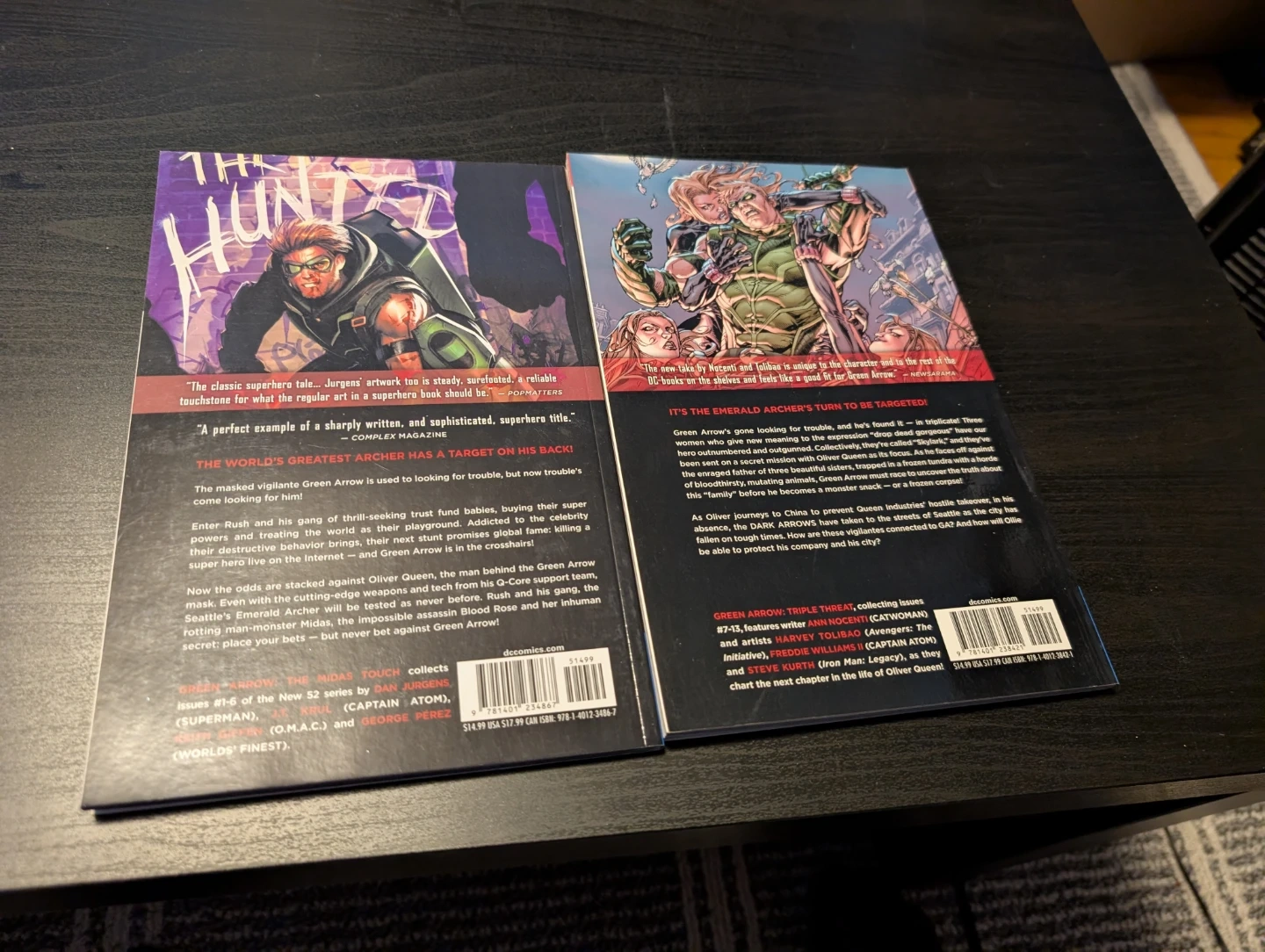 DC Comics Green Arrow "The New 52!" comic books. Volume 1 is titled "The Midas Touch" and Volume 2 is "Triple Threat." These collected editions feature thrilling adventures of the Emerald Archer. Great for comic book collectors and fans of the Green Arrow character!