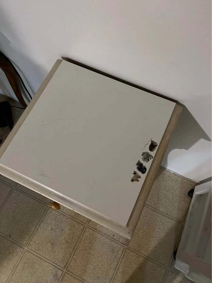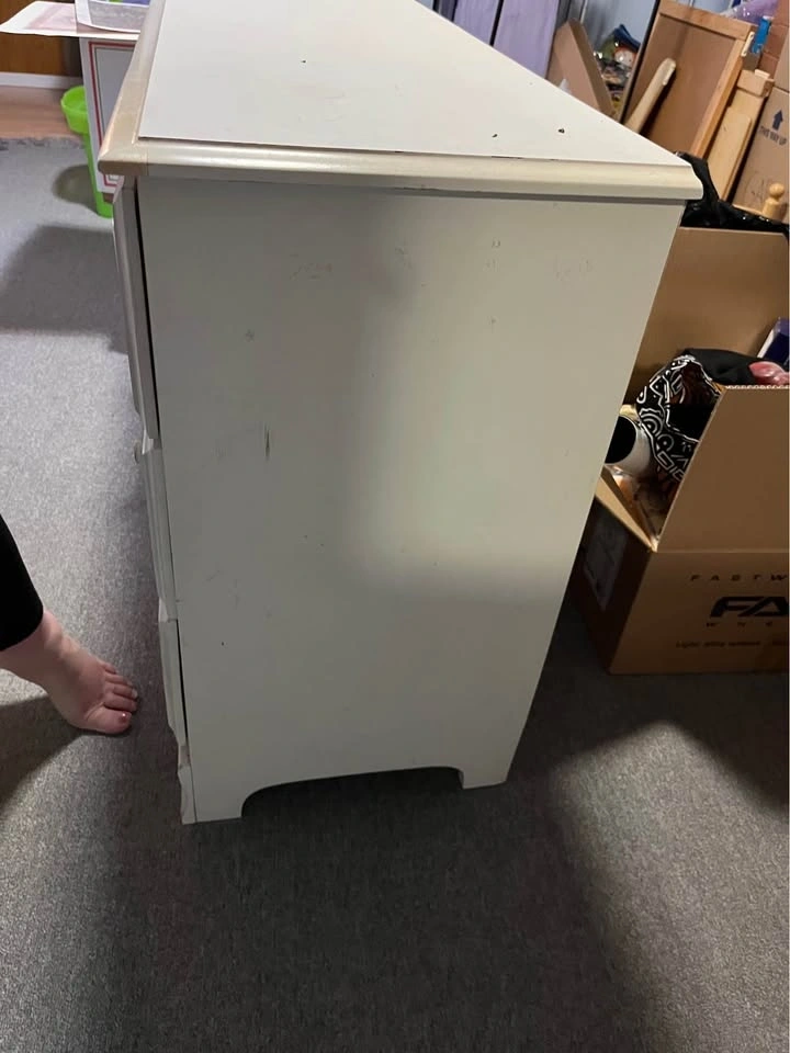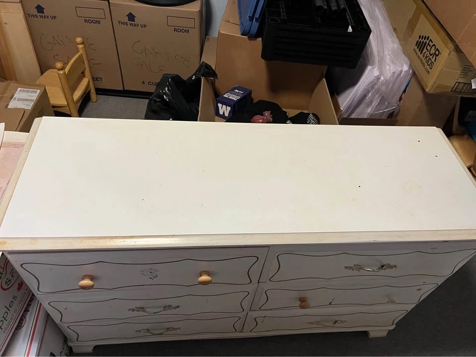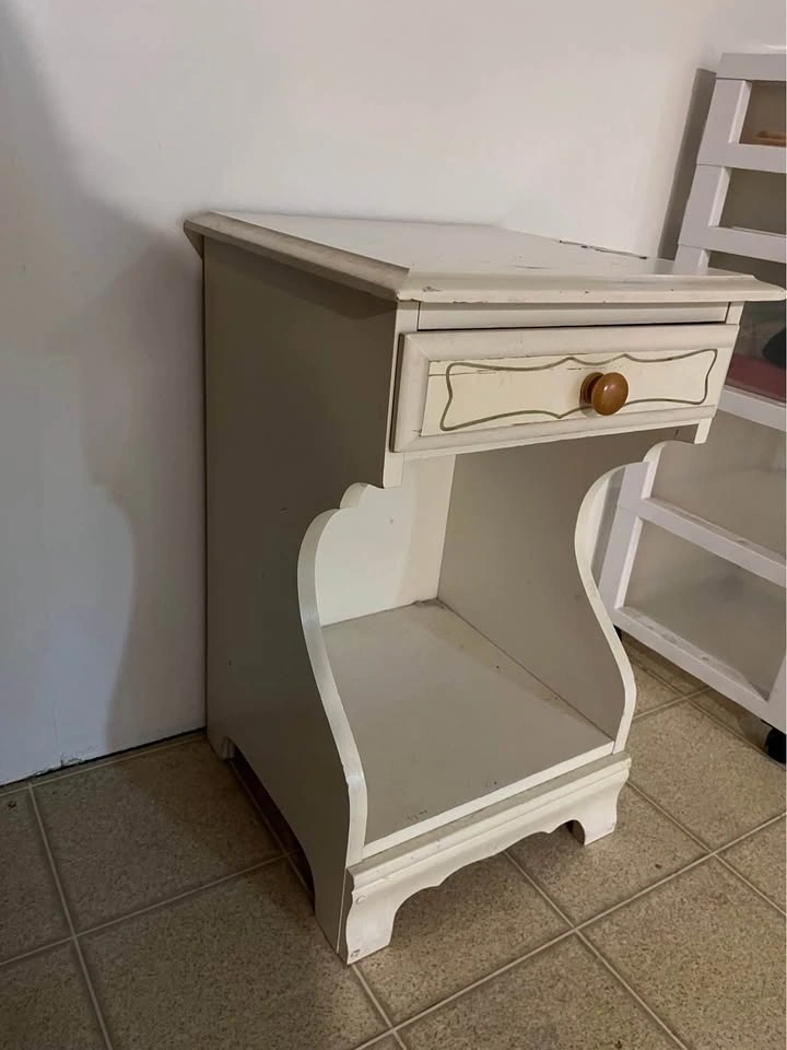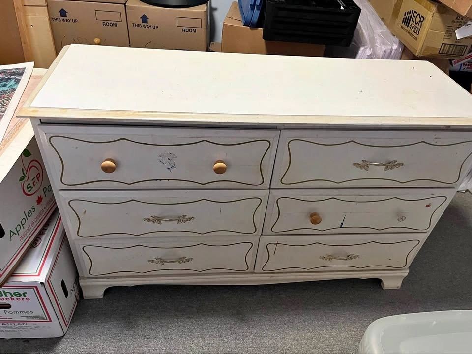 Dresser has 6 drawers and nightstand has 1 drawer with an open shelf. Both pieces have gold trim detail on drawer fronts. Dresser has mixed wooden knob and ornate metal handles. Needs some TLC. Smoke free, bug free, pet friendly.