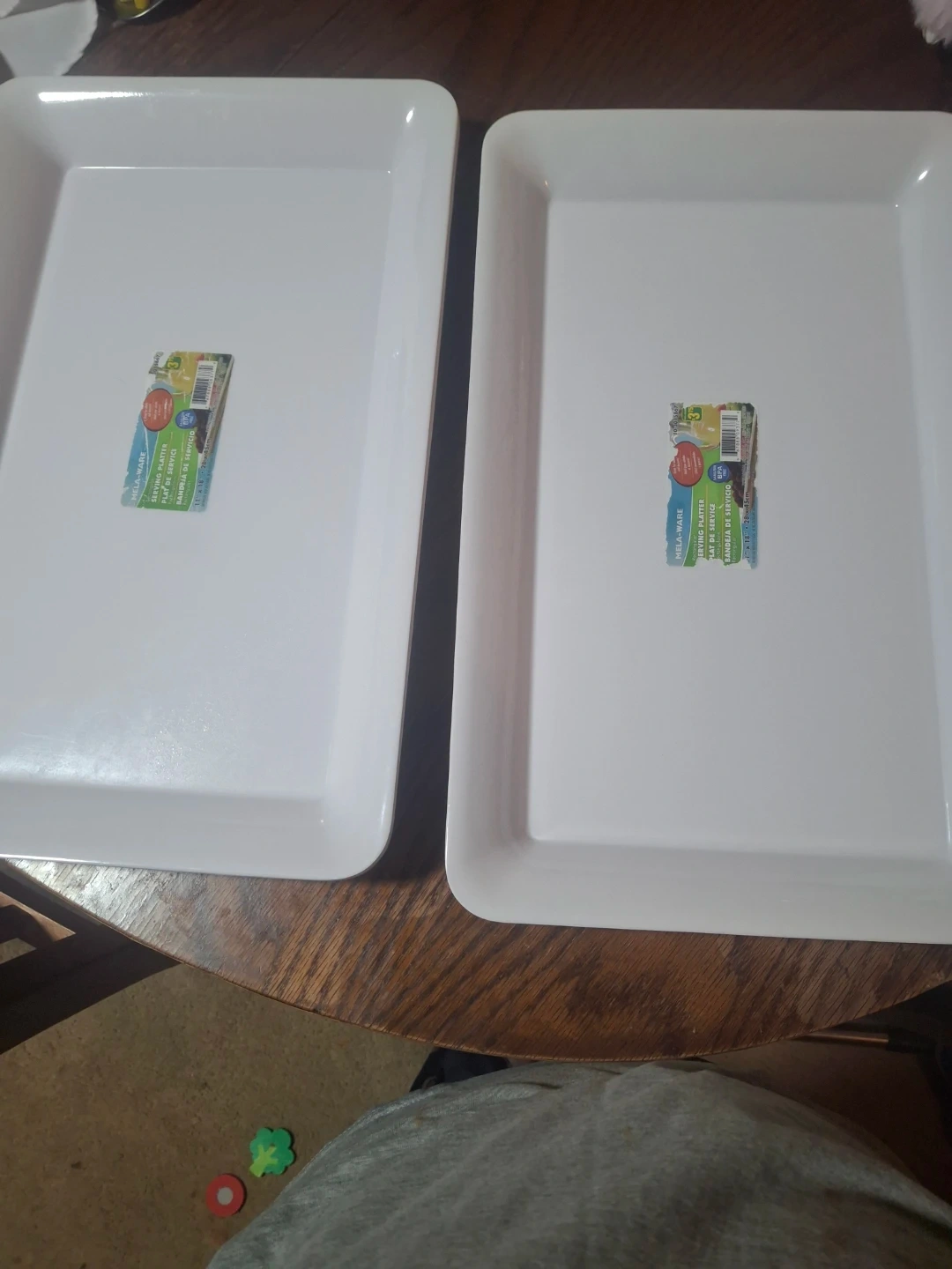 Set of 4 Mela-Ware serving platters. White plastic construction. Each platter measures 11 x 18 inches. These are great for serving appetizers or desserts at gatherings!
