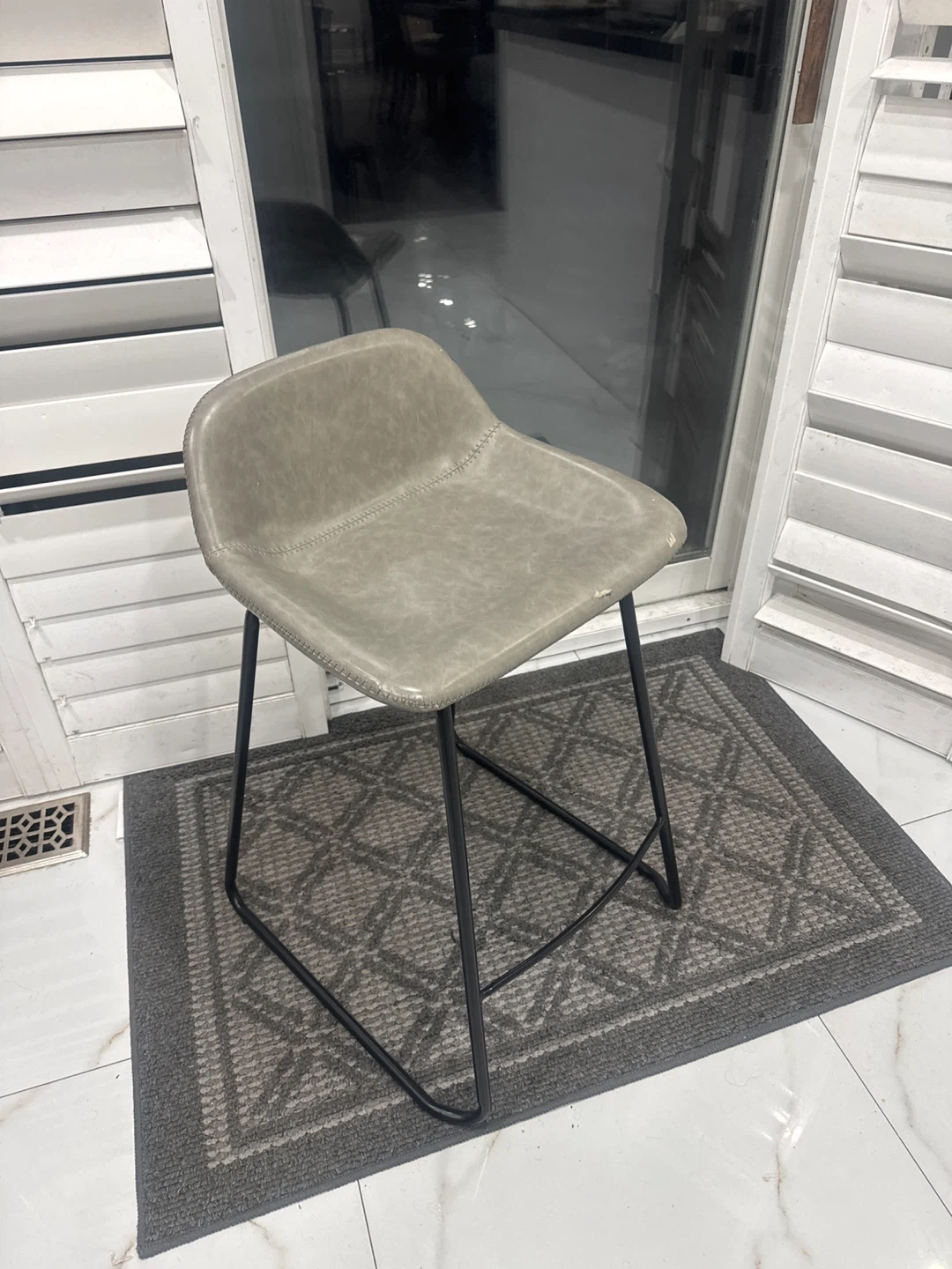 Grey bar stool with faux leather seat and black metal legs. It's a modern stool that would fit well in a kitchen or home bar. The seat has stitched detailing.